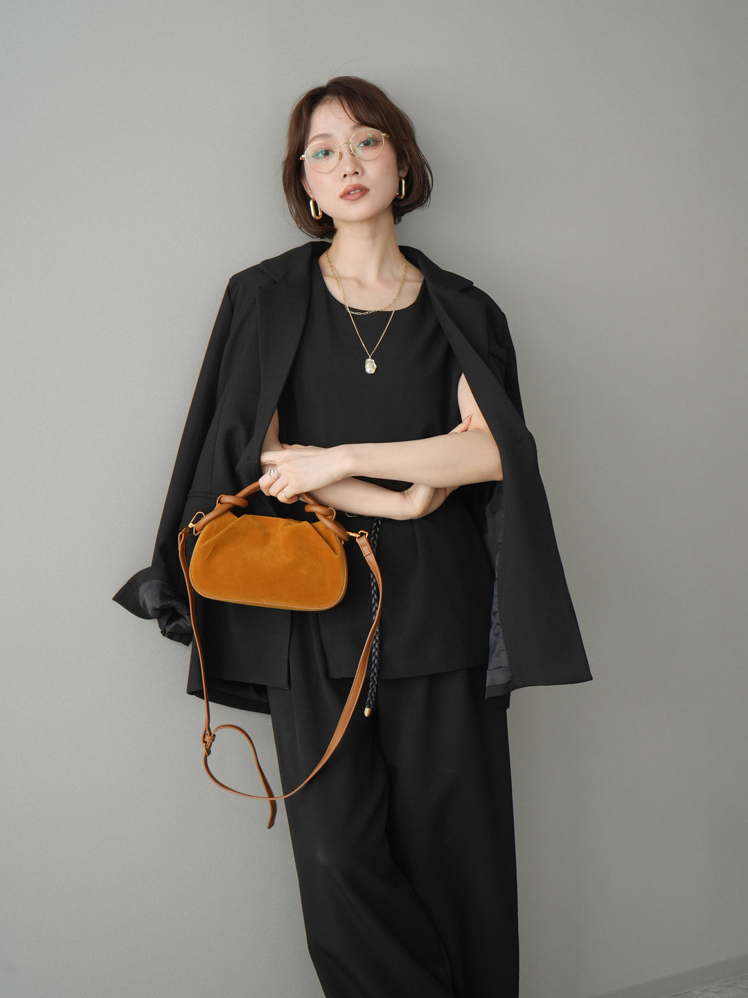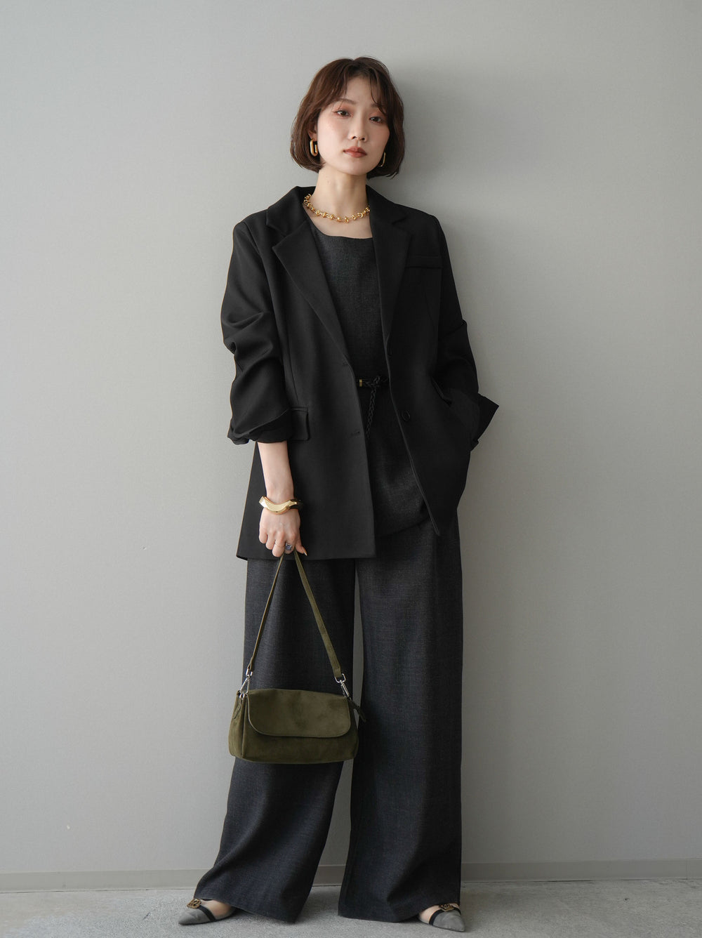 [SET]ベルト付ノースリーブトップス&ワイドパンツSETUP+バックスリットデザインジャケット(2set)