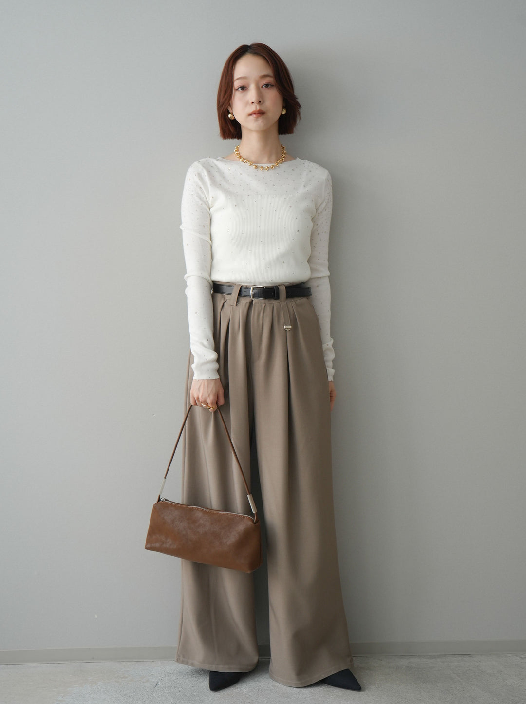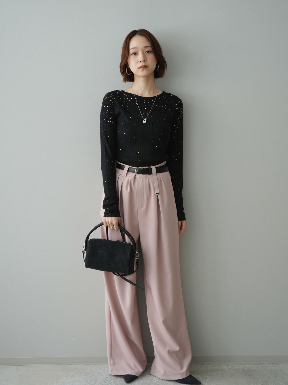 [SET]スパンコールシアーニットトップス+ベルト付キーホルダーモチーフワイドパンツ(2set)