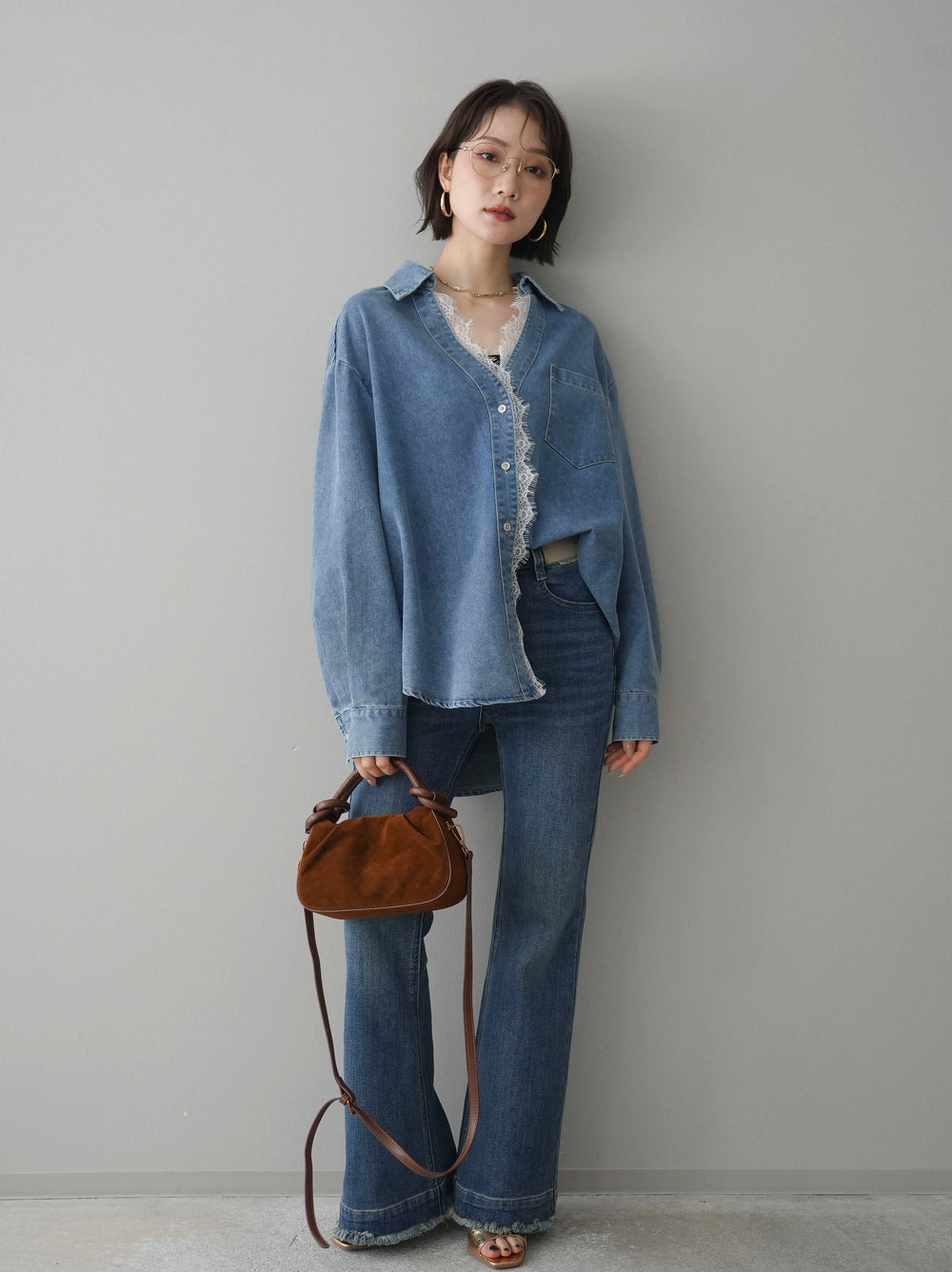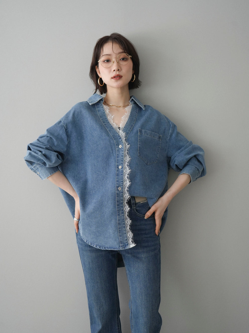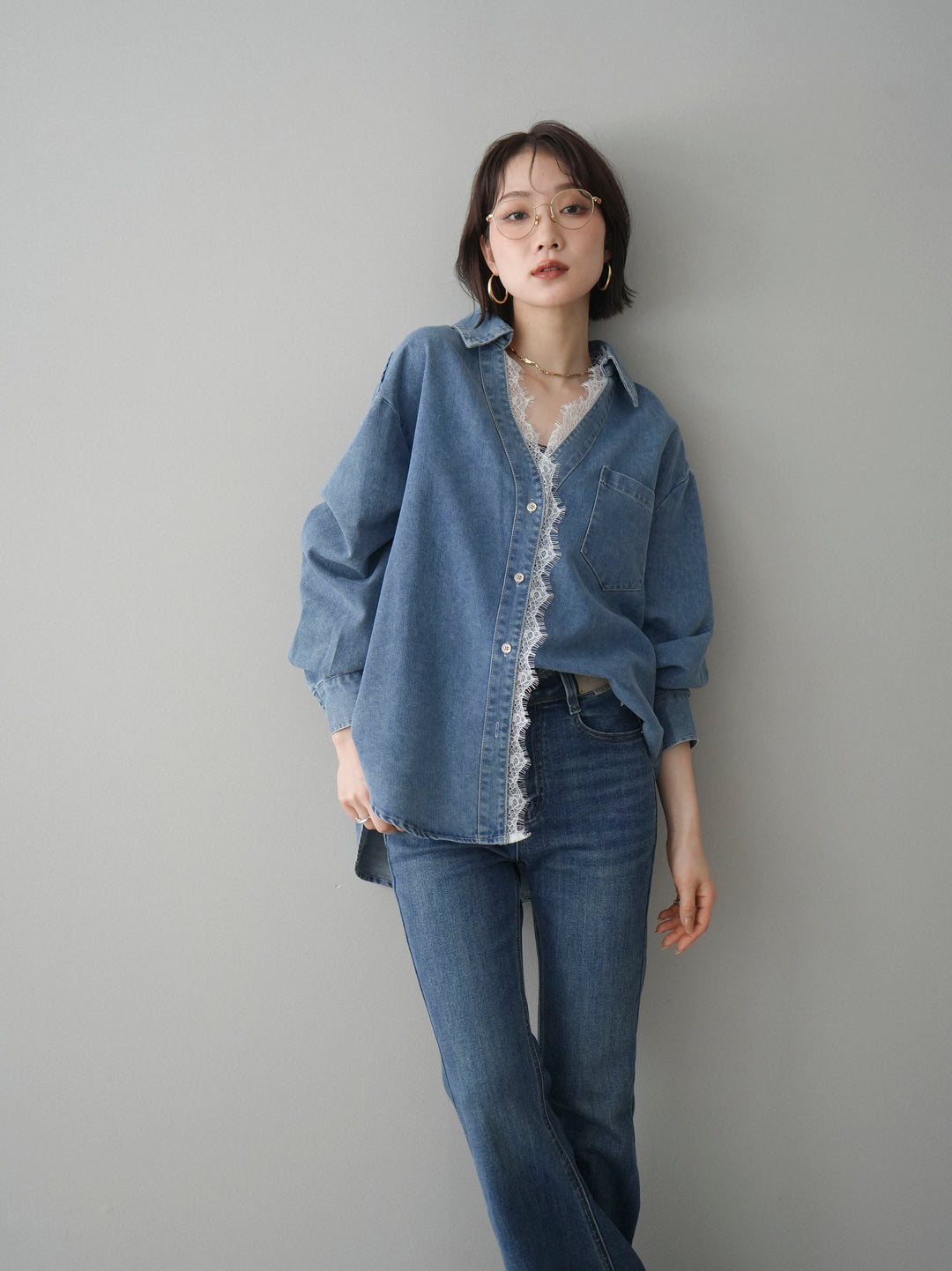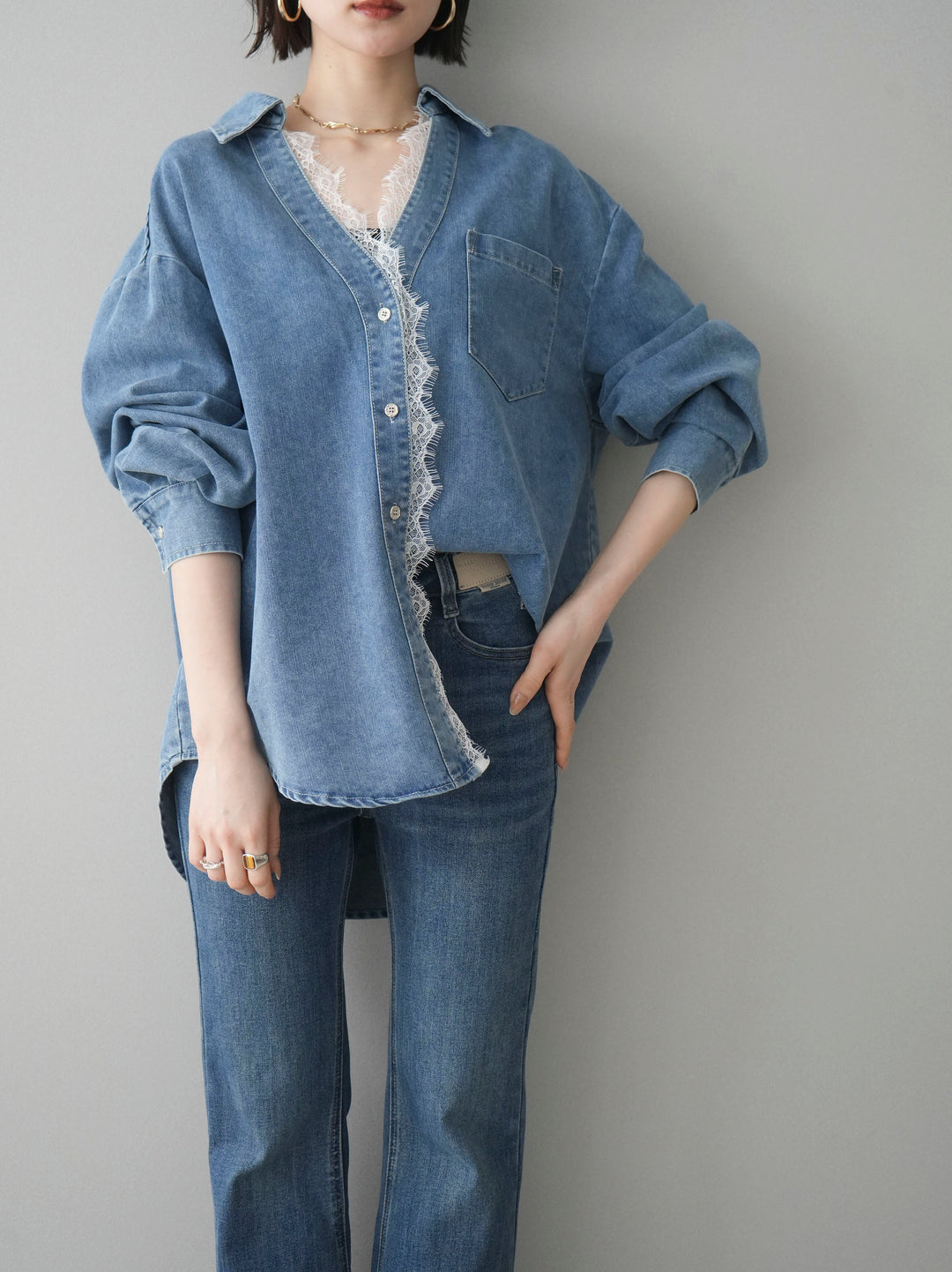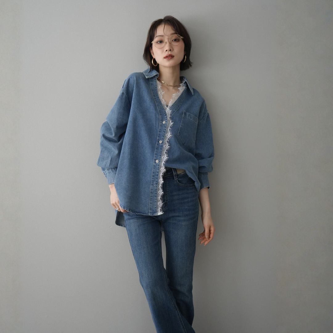 [SET]レースレイヤードデニム開襟シャツ+選べるアクセセット(2set)