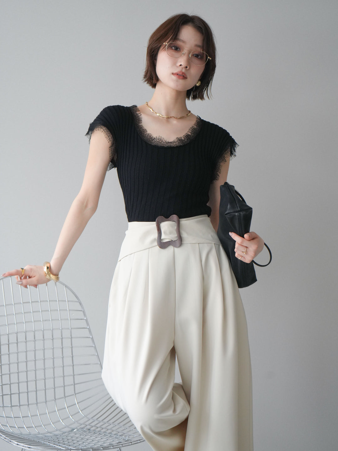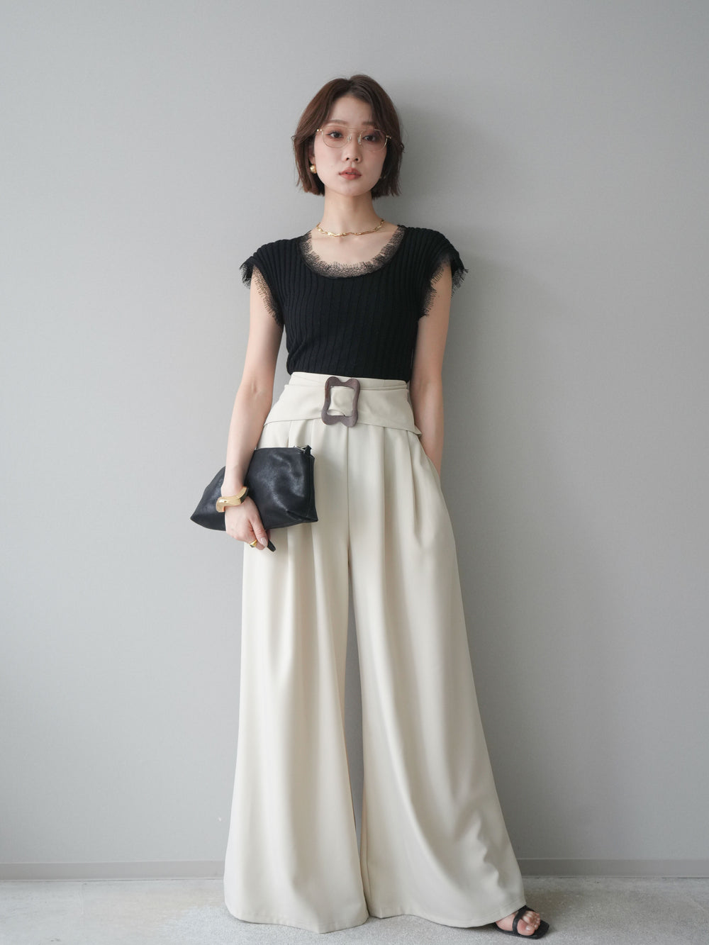 [SET]レーストリムリブニットトップス+バックルポイントワイドパンツ(2set)