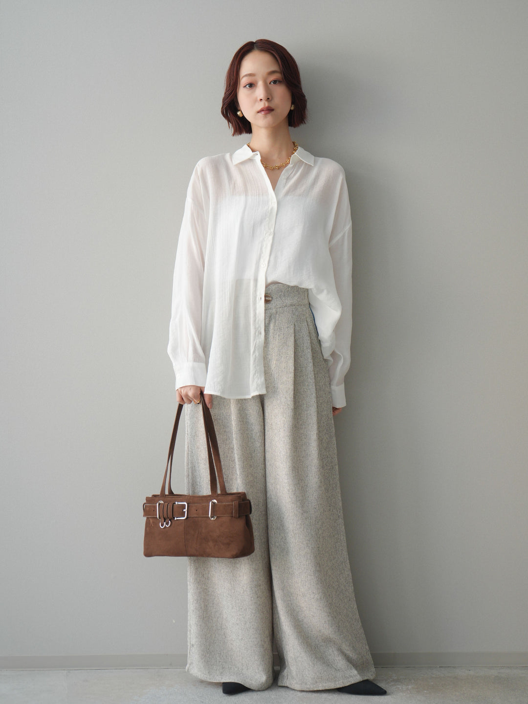 [SET]バックデザインシアーシャツ+異素材サマーツイードワイドパンツ(2set)