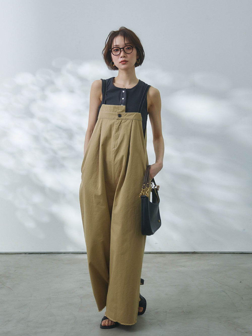 【Allure】[SET]カットオフコットンツイル配色ステッチサロペット+フロントボタンテレコリブタンクトップ(2set)