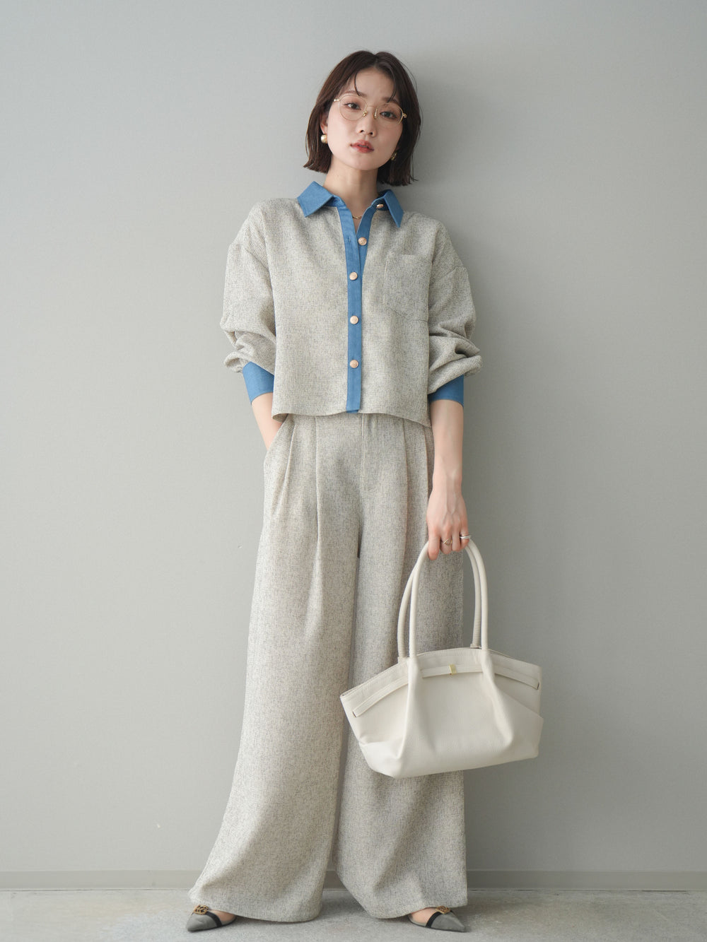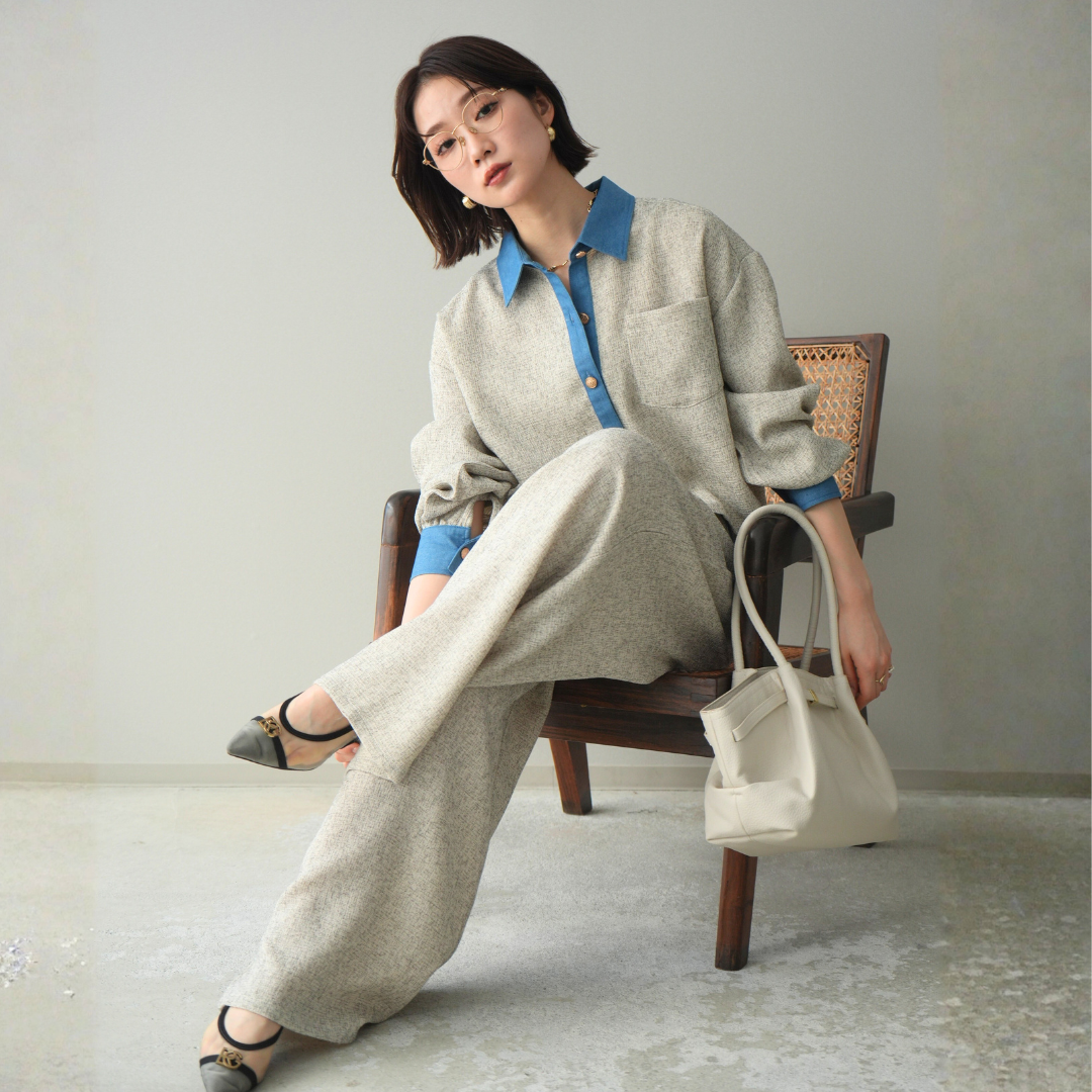 [SET]異素材サマーツイードシャツ+異素材サマーツイードワイドパンツ(2set)