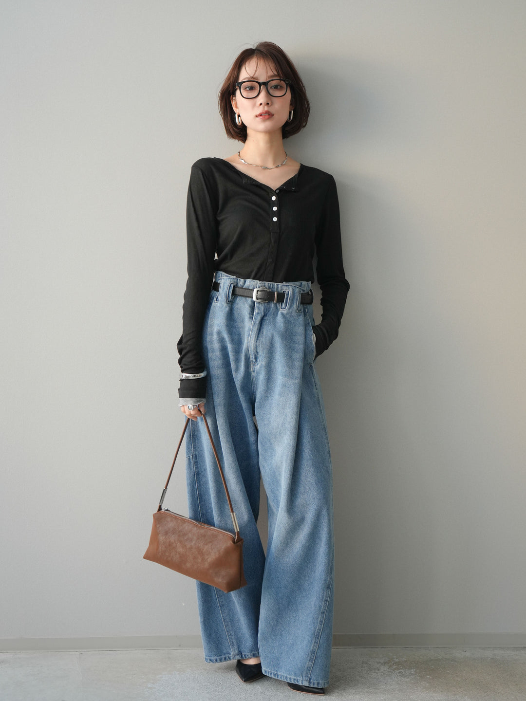 [SET]シアーリブバイカラーカーディガン+ハイウエストベルトループデザインデニムパンツ(2set)