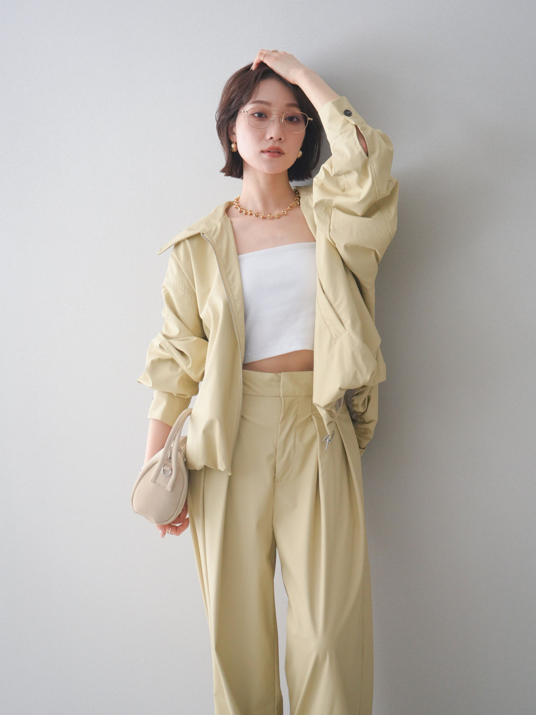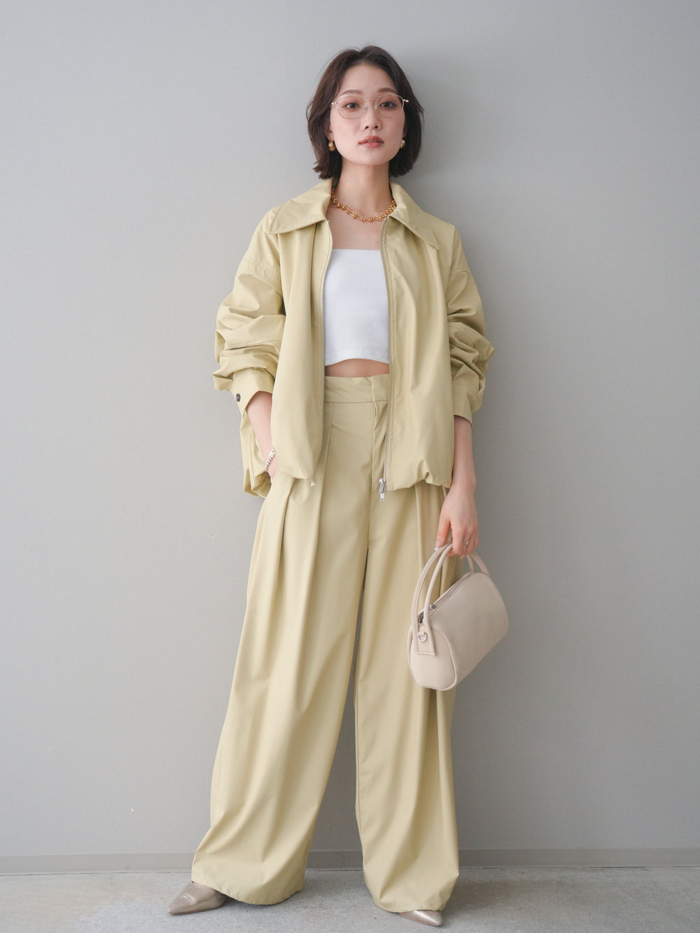 [SET]ウォッシャブルフェイクレザーバルーンジャケット+ウォッシャブルフェイクレザータックワイドパンツ(2set)