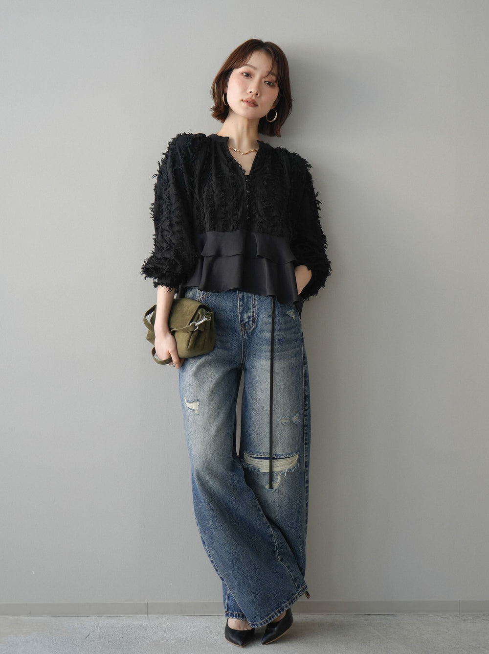 [SET]ジャガードぺプラムフリルブラウス+ダメージデニムセミワイドパンツ(2set)