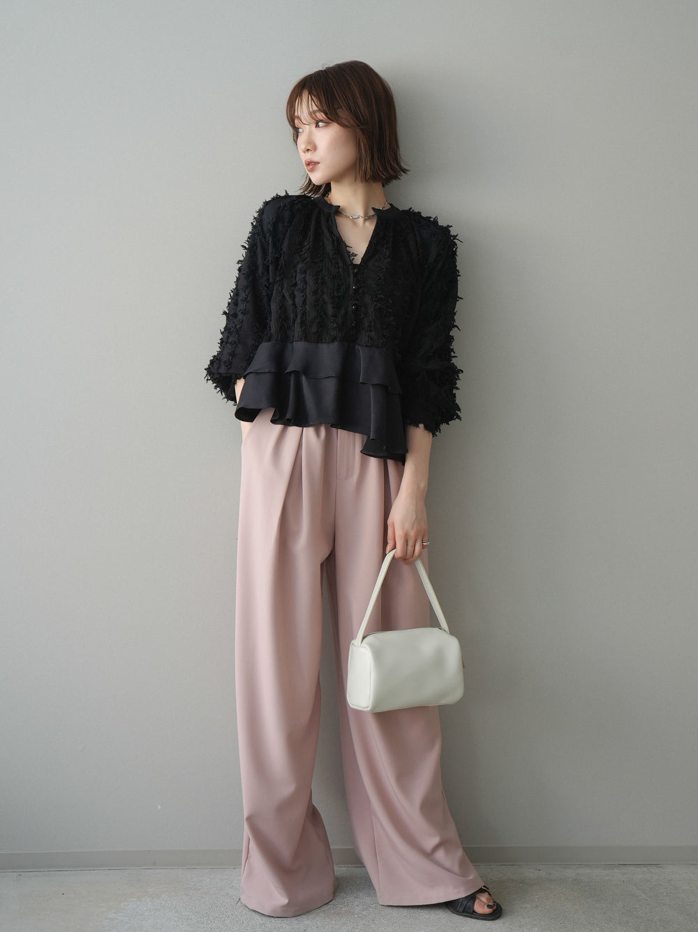 [SET]ジャガードぺプラムフリルブラウス+ベルト付キーホルダーモチーフワイドパンツ(2set)