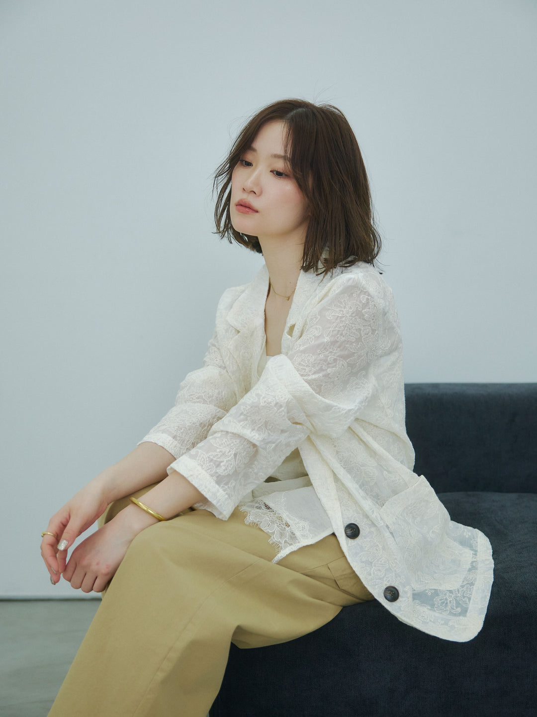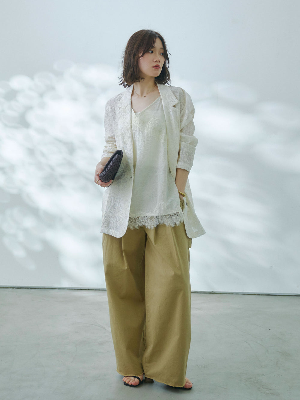 【Allure】[SET]ストレッチレースカーディガン+カットオフコットンツイルタックワイドパンツ(2set)