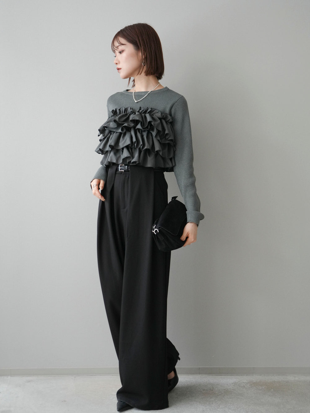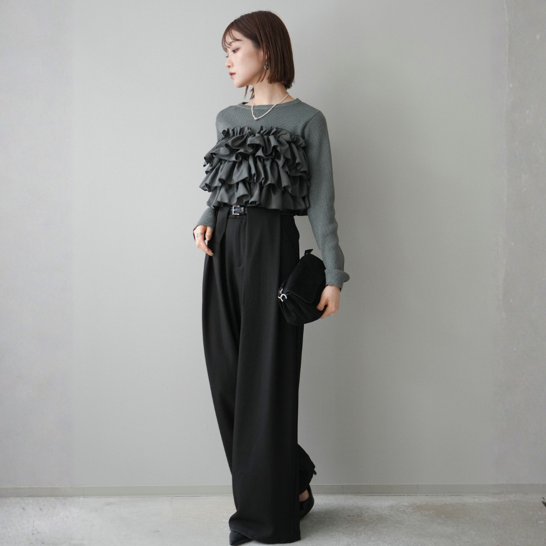[SET]フリルビスチェドッキングスポンジニットプルオーバー+ベルトループデザインワイドパンツ(2set)