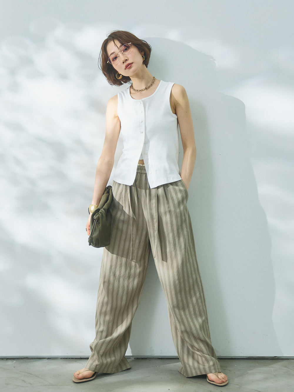 【Allure】[SET]フロントボタンテレコリブタンクトップ+ストライプイージーパンツ(2set)
