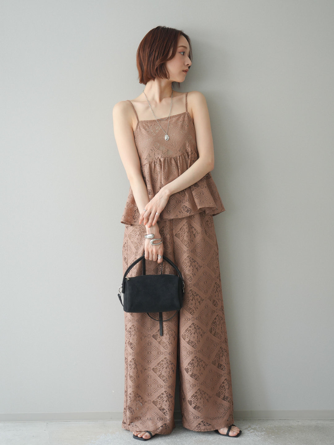 [SET]バックレースアップフレアキャミソール+シアーレースイージーパンツ(2set)