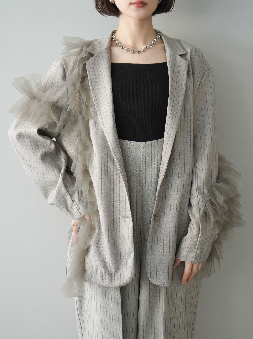 [予約]アシンメトリーチュールストライプジャケット/greige