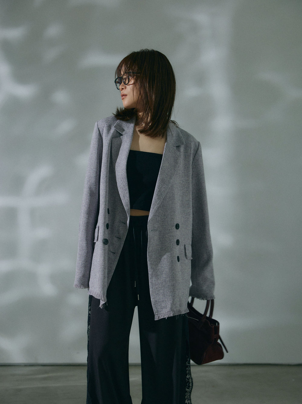 【Allure】[SET]スラブツイードフリンジテーラージャケット+サイドピンタックレースイージーワイドパンツ(2set)
