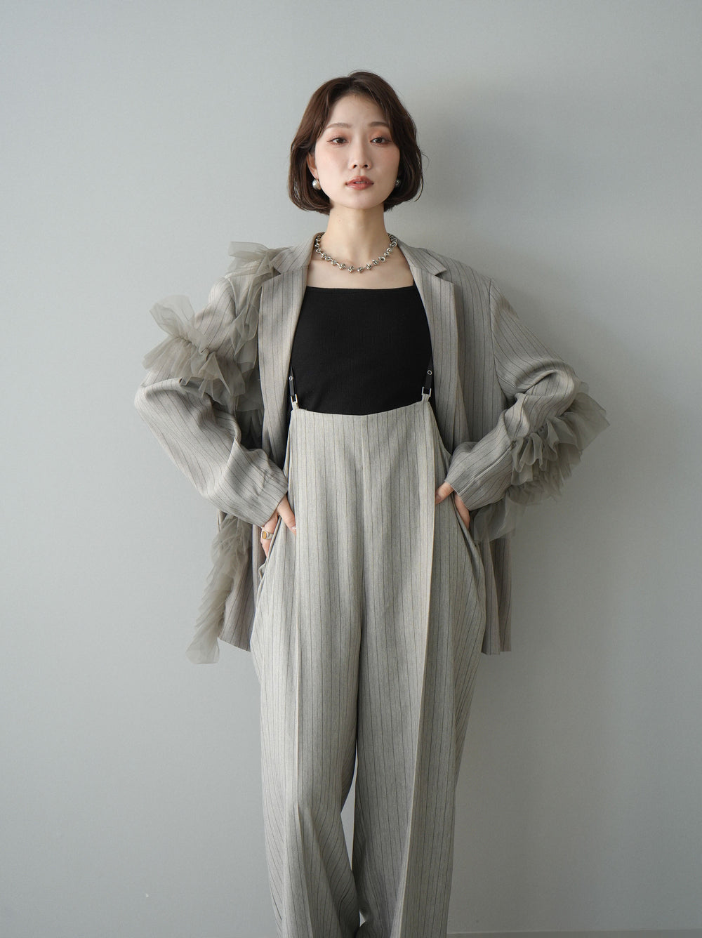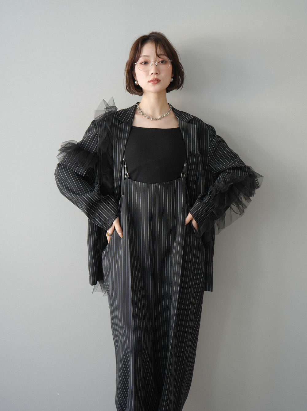 【着回しセット】[SET]チュールドッキングシアーストライプビッグカフスオーバーサイズシャツ+ベルトデザインサロペット+カップ付きバッククロスキャミソール(3set)