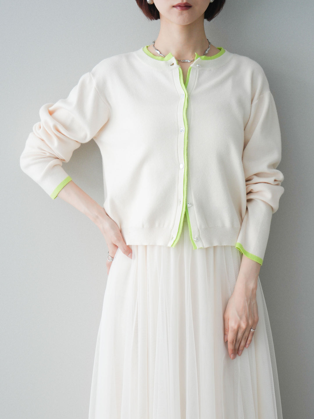 [予約]レイヤードデザイン配色ニットカーディガン/ivorylime