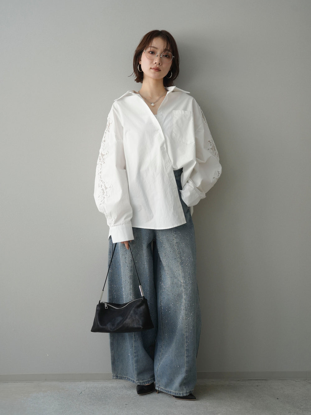[SET]アームレースブロードシャツ+フロントビジューカーブデニムパンツ(2set)