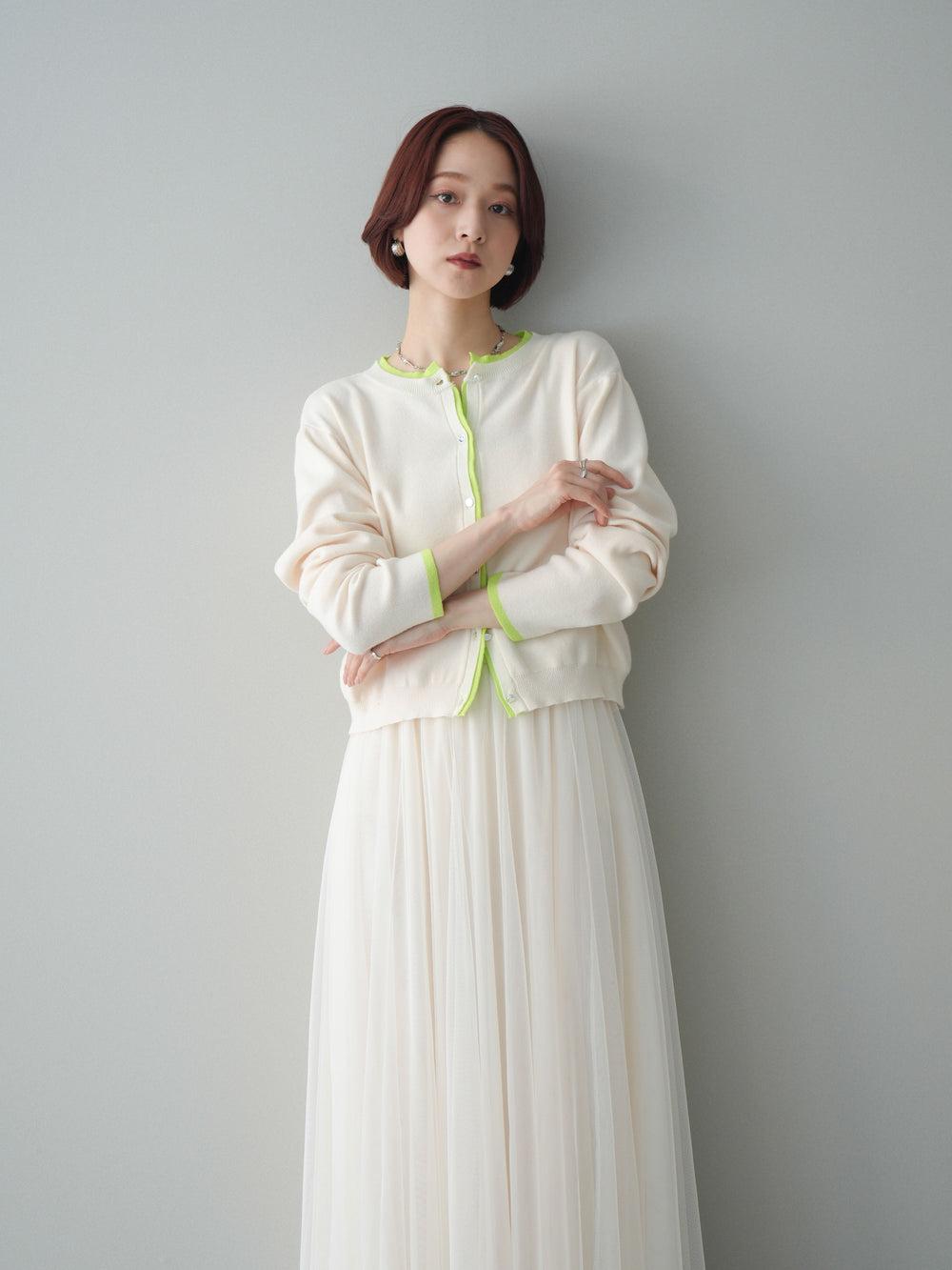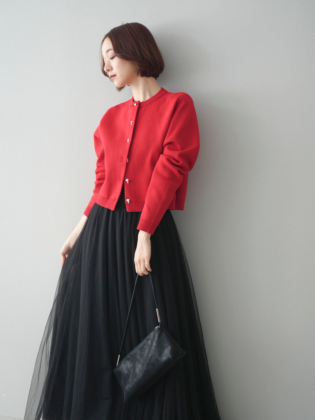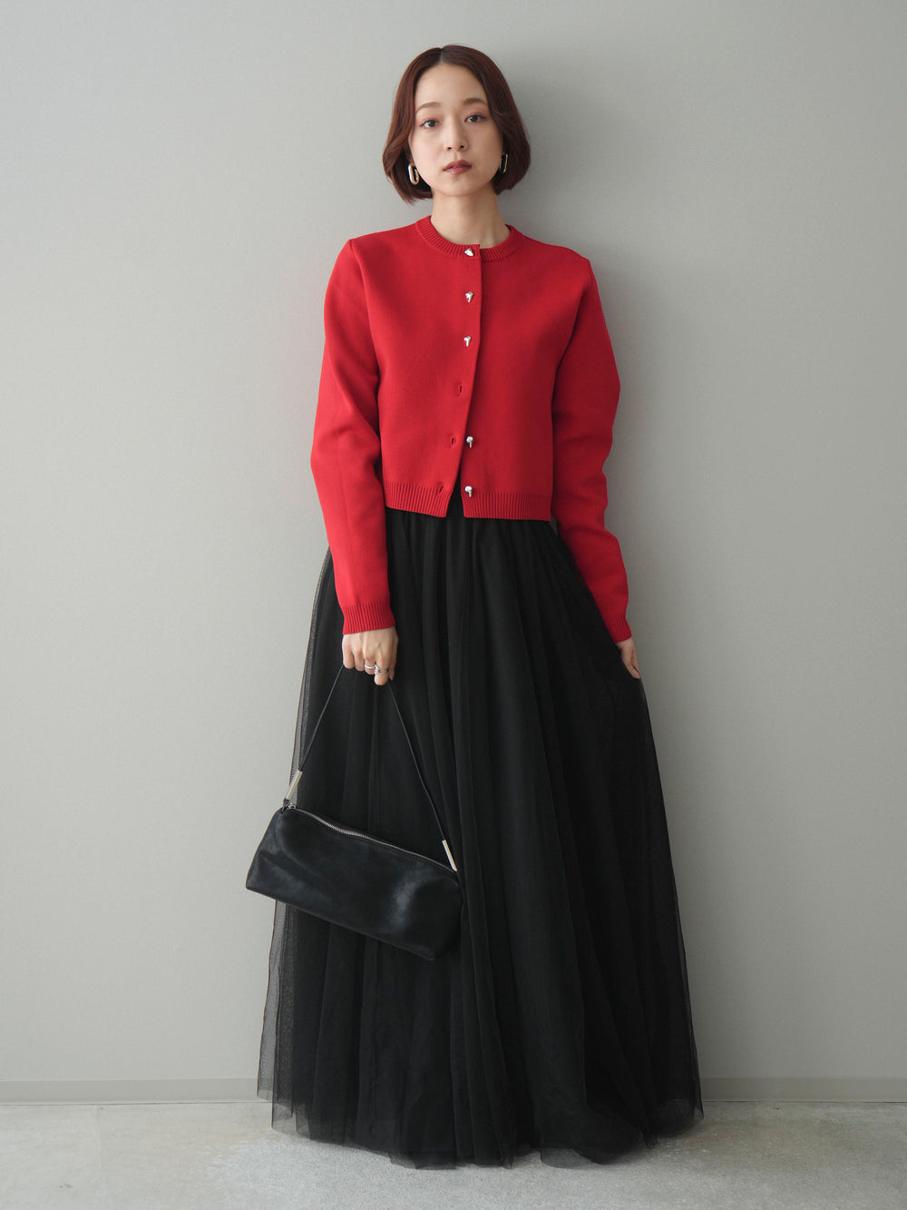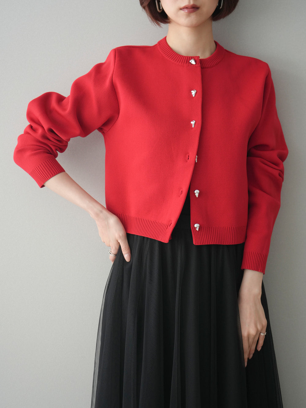 [SET]メタルボタンクロップドポリエステルニットカーディガン+チュールボリュームスカート(2set)