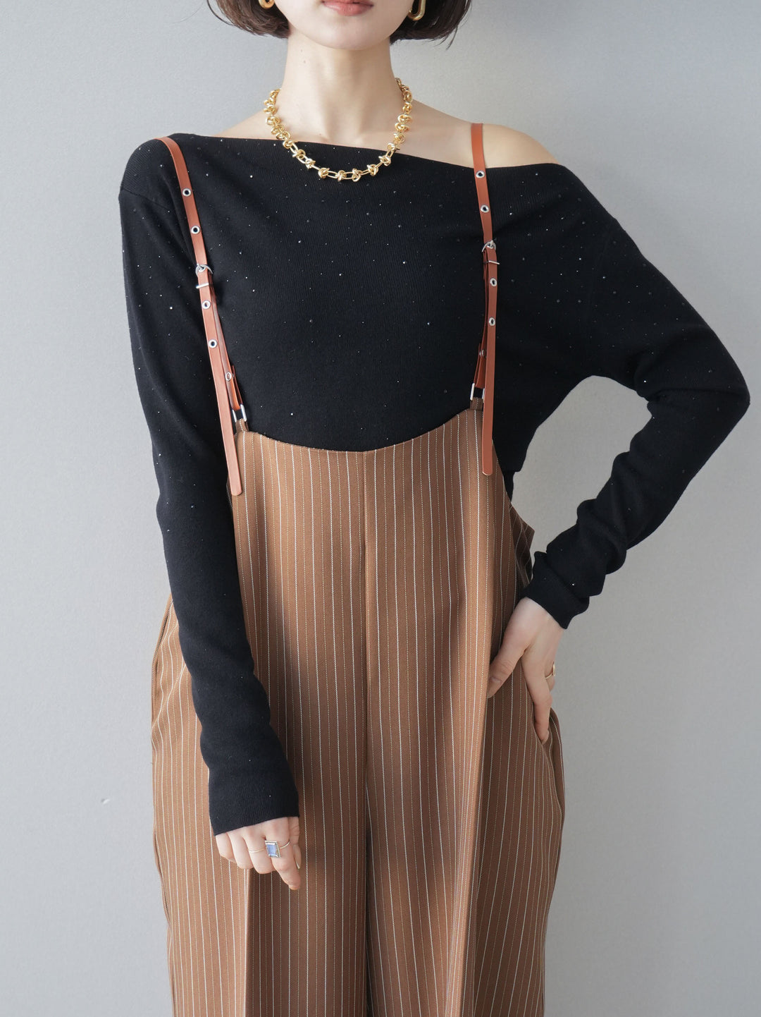 [予約]ヘリンボーンストライプサス付サロペット/goldbrown