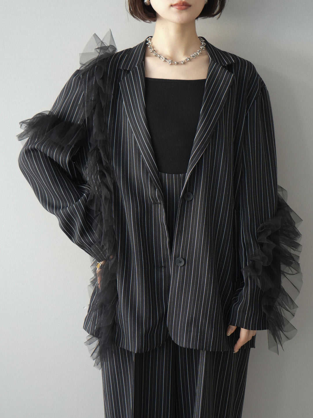 [予約]アシンメトリーチュールストライプジャケット/black