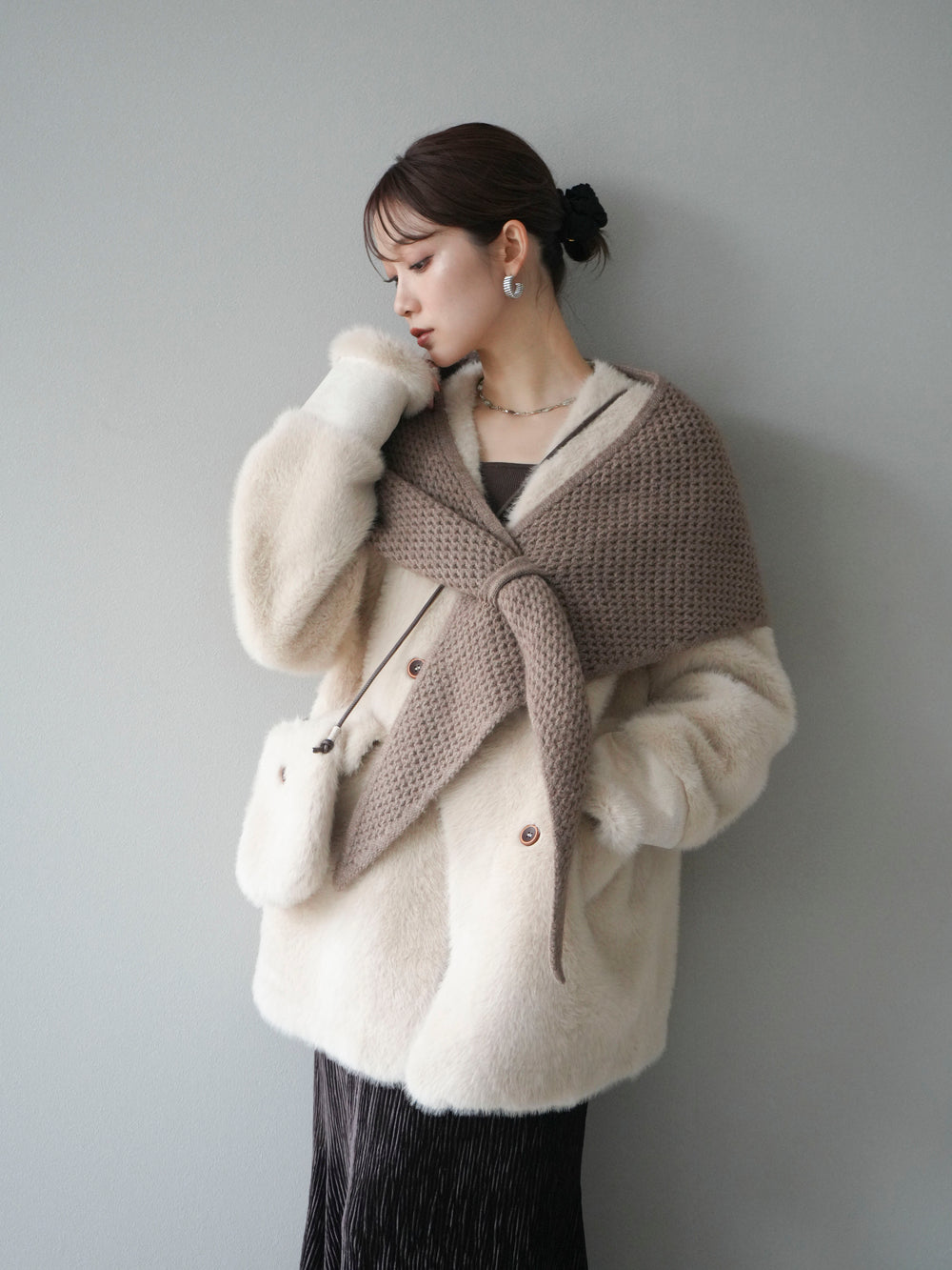 [予約]バッグ付エコファーノーカラーコート/brown