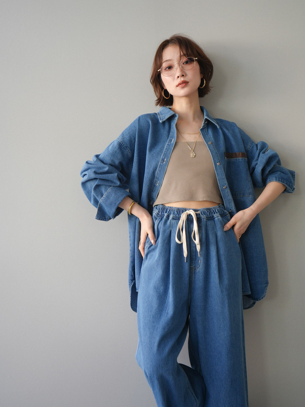 [SET]ポイントレザーオーバーデニムシャツ+ドロストワイドデニムパンツ(2set)