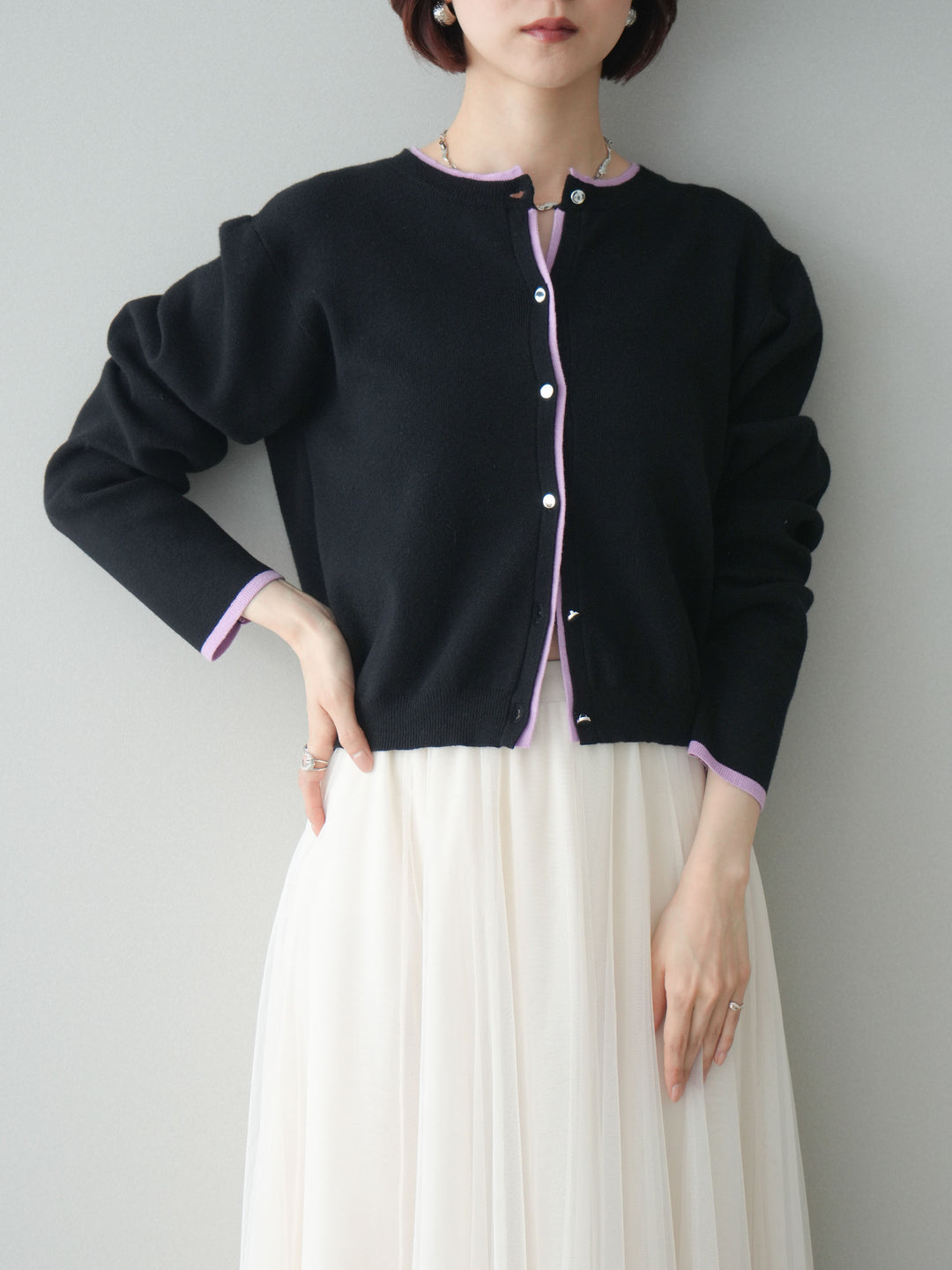 [予約]レイヤードデザイン配色ニットカーディガン/blacklavender