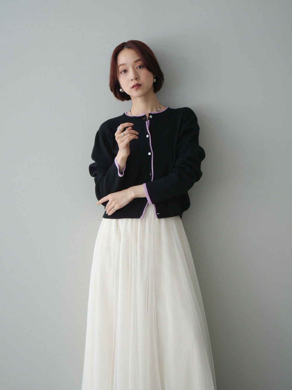 [SET]モチーフ付silverボタンミックスニットカーディガン+チュールボリュームスカート(2set)