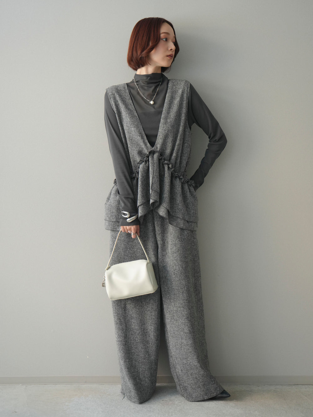【Allure】[SET]オーガンジーバルーンキャミアンサンブルニット+アシンメトリーウエストタックパンツ(2set)