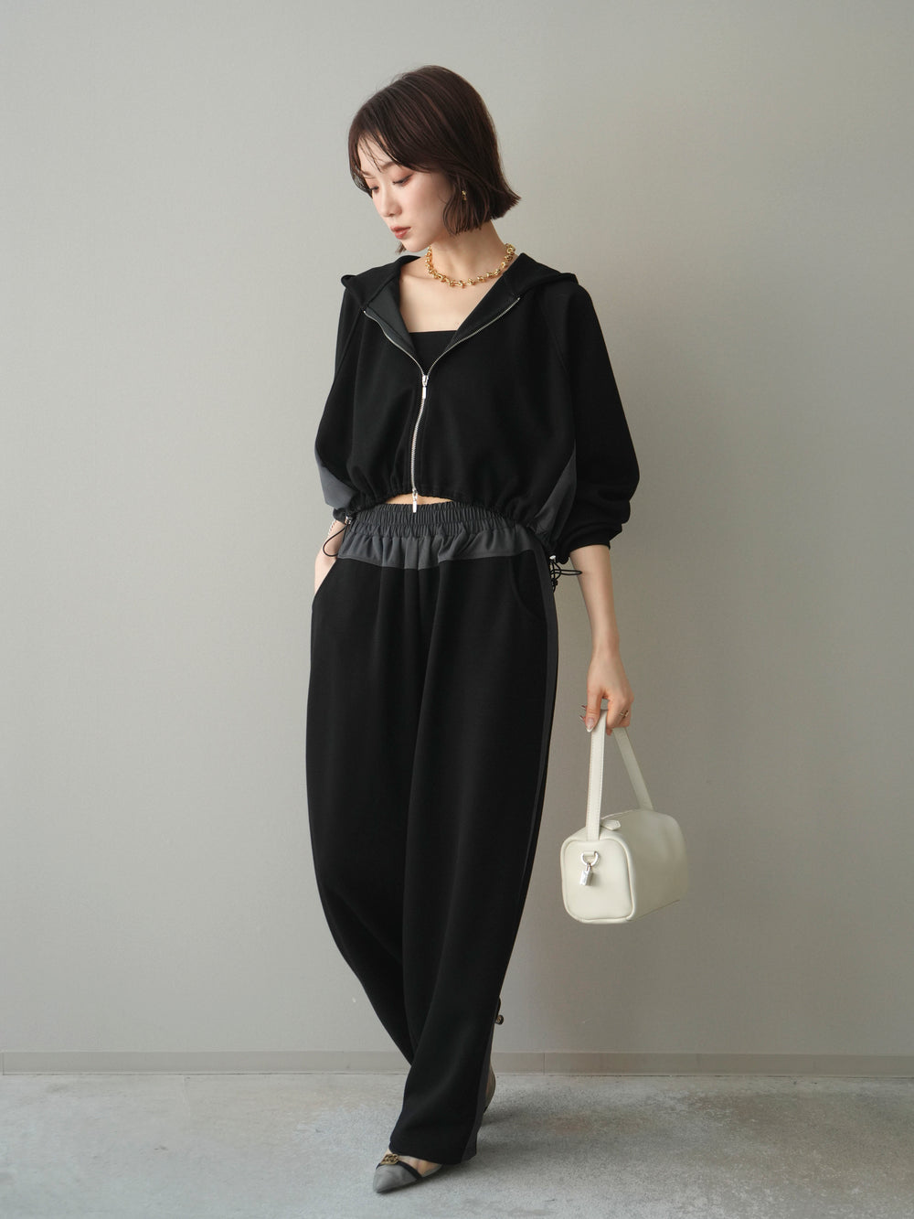 [SET]バイカラー異素材ライトポンチクロップドZIPフーディー+バイカラー異素材サイドラインライトポンチパンツ(2set)