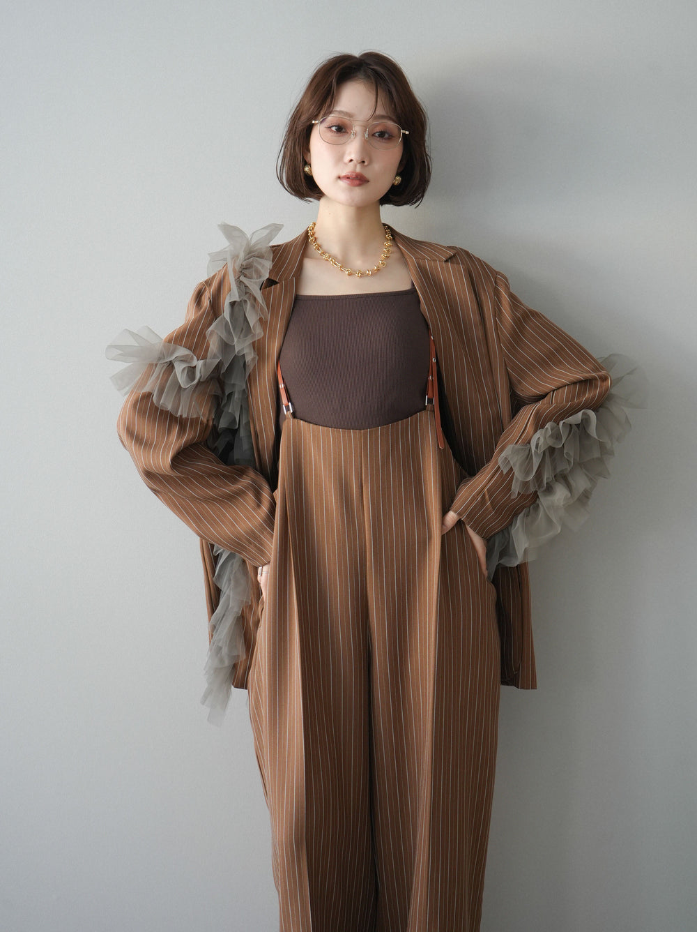 [予約]アシンメトリーチュールストライプジャケット/goldbrown