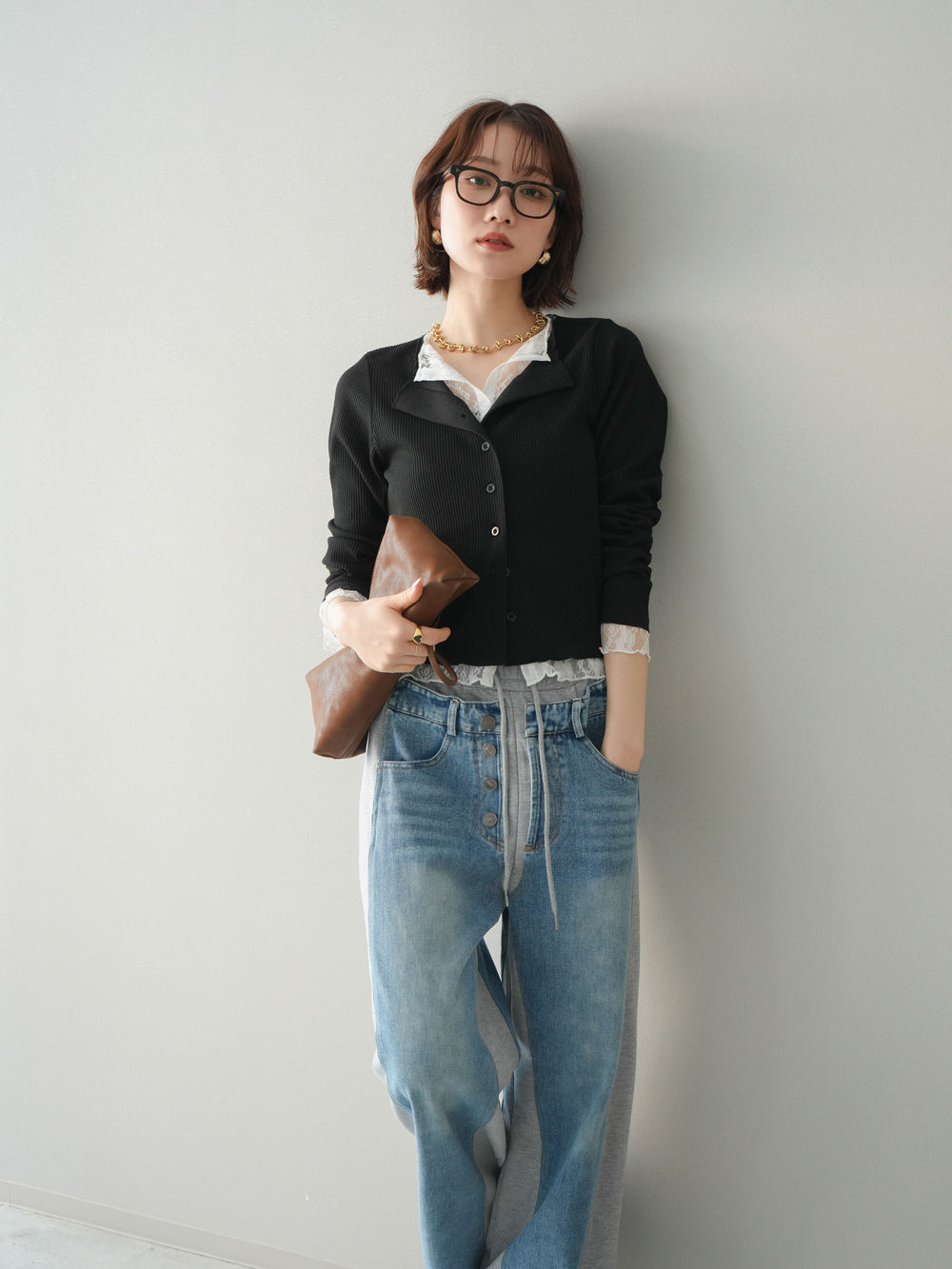 [SET]レースドッキングテレコリブカーディガン+デニム切替スウェットパンツ(2set)