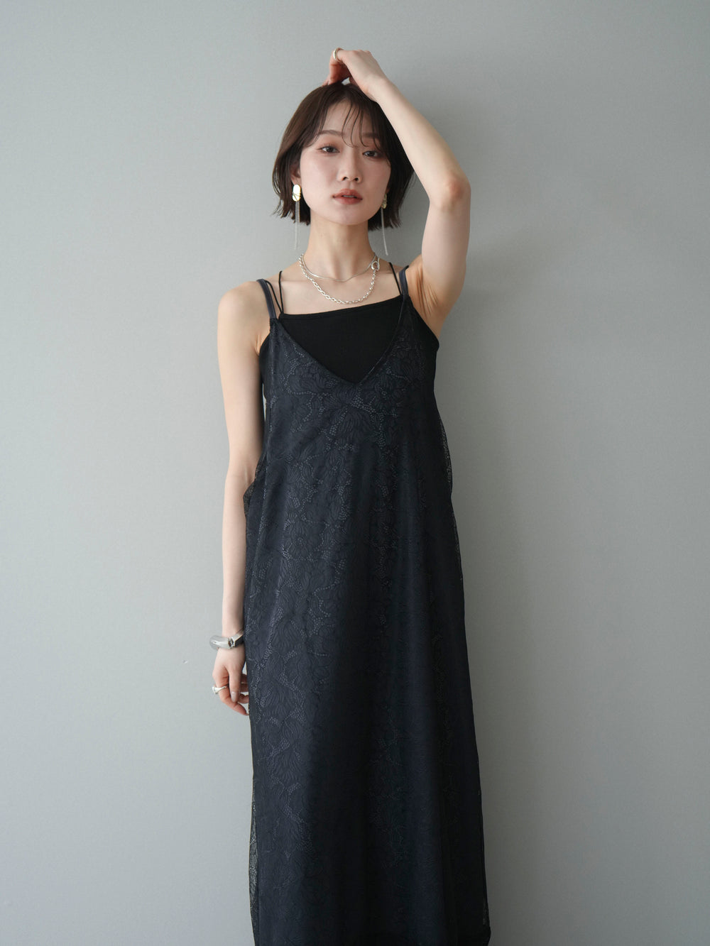 [予約]サテンレースレイヤードキャミワンピース/black