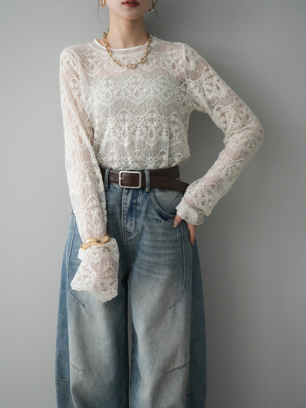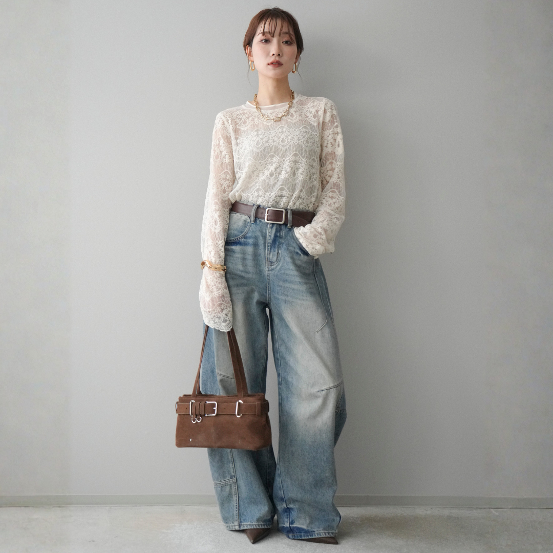 [SET]チュールレーストップス+ベルト付カーブデニムパンツ(2set)