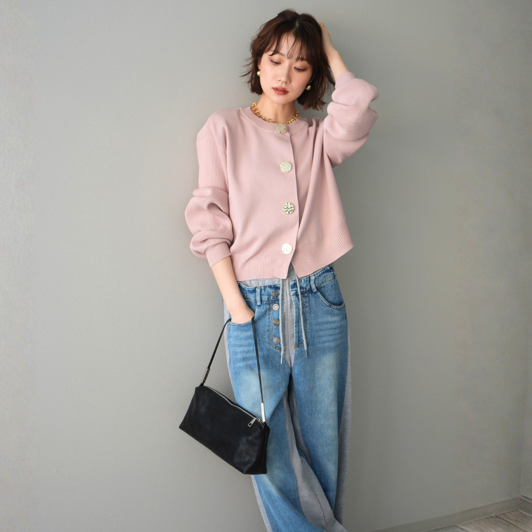 [SET]メタルボタンクルーネックニットカーディガン+デニム切替スウェットパンツ(2set)