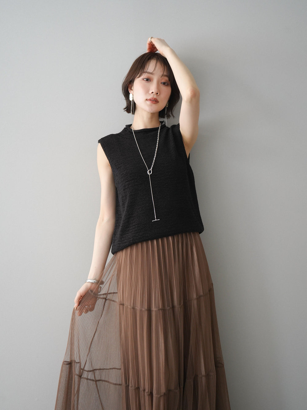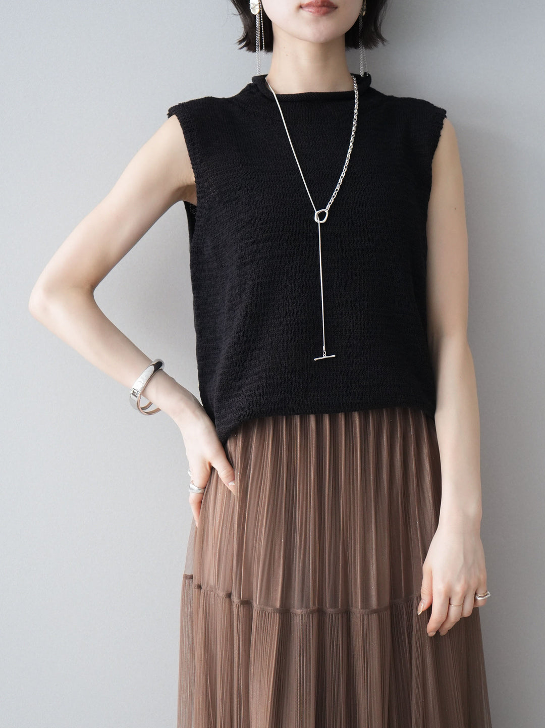 [SET]ラインストーンアシンメトリーニットトップス+ラメプリーツレイヤードチュールロングスカート(2set)