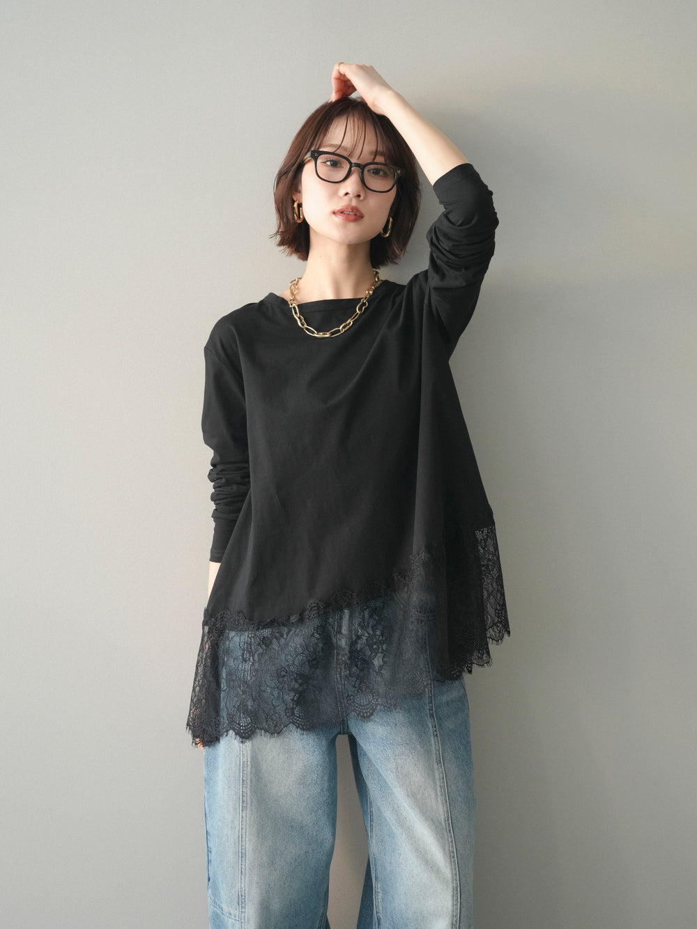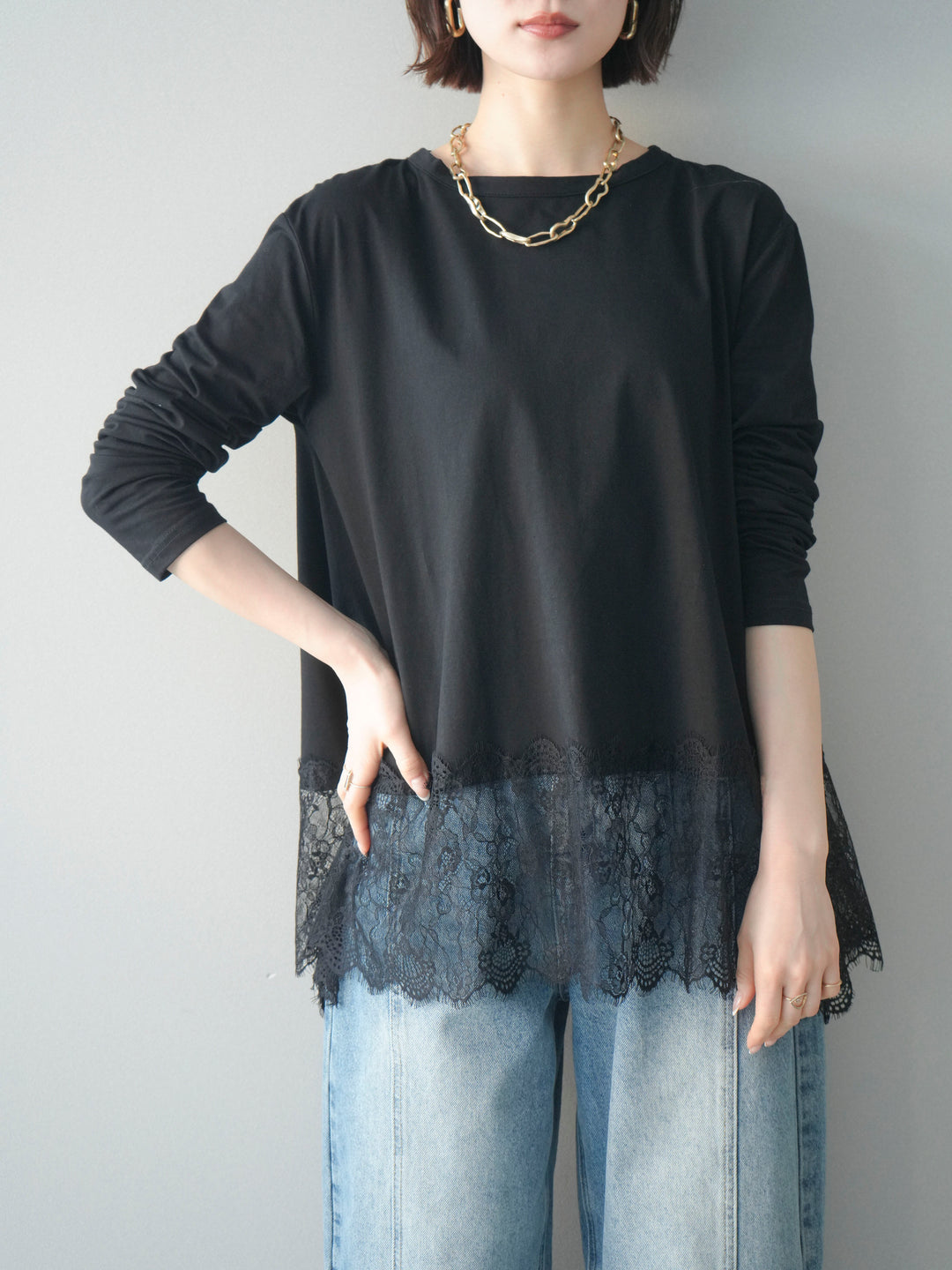 [予約]裾レースロングスリーブTシャツ/black