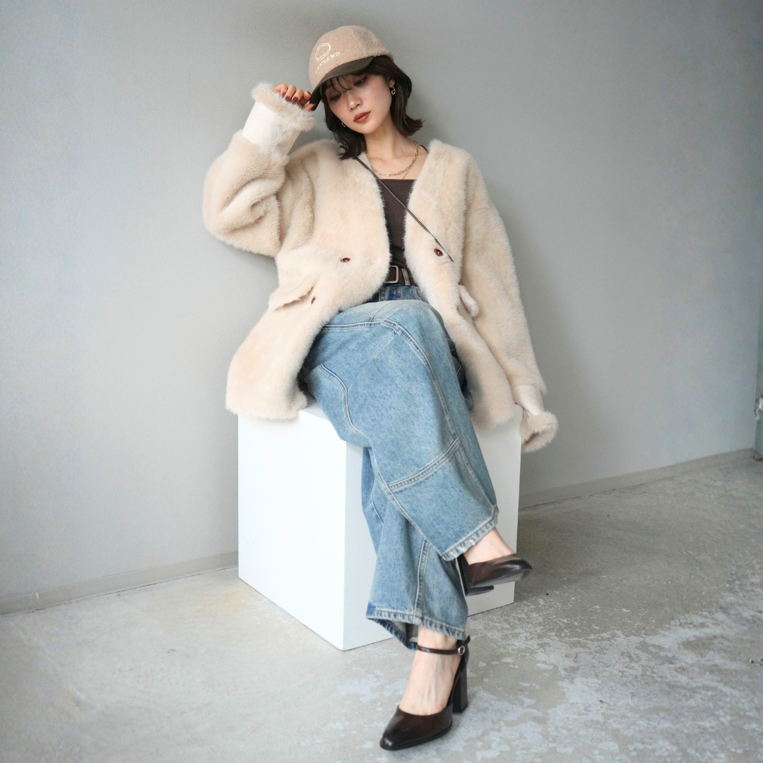 [SET]バッグ付エコファーノーカラーコート+ベルト付カーブデニムパンツ(2set)
