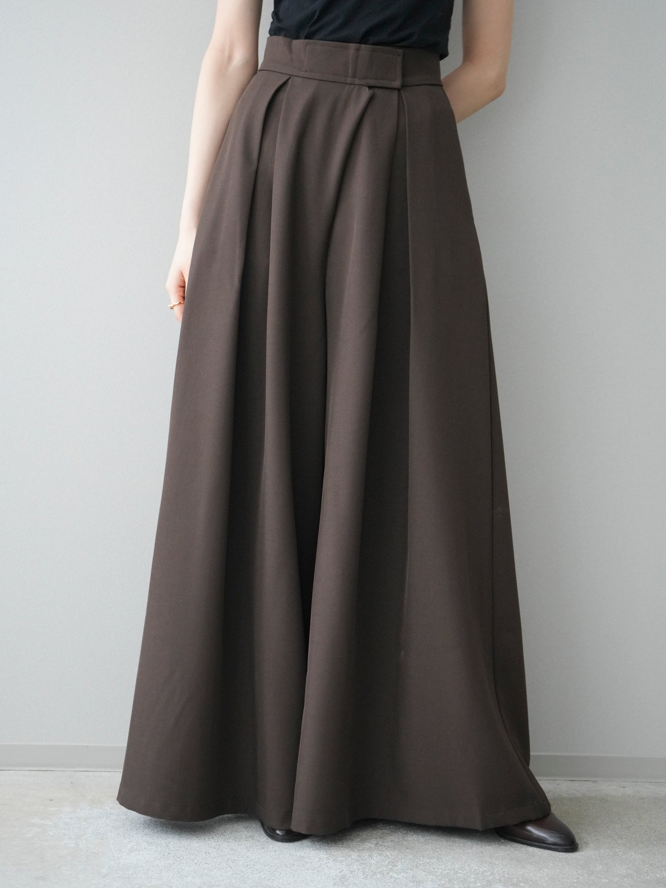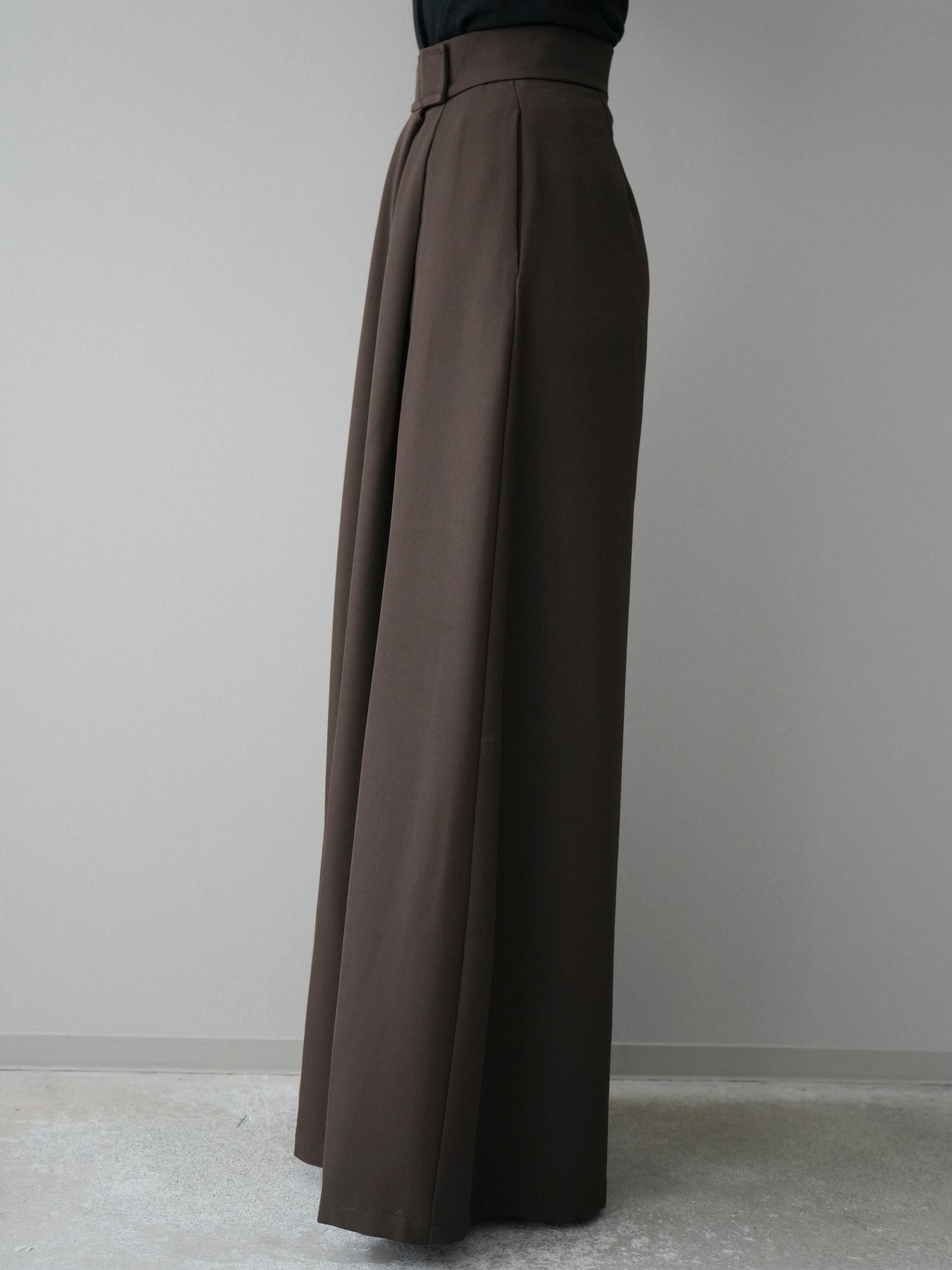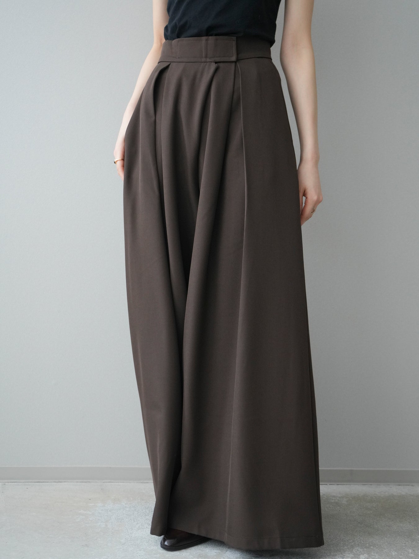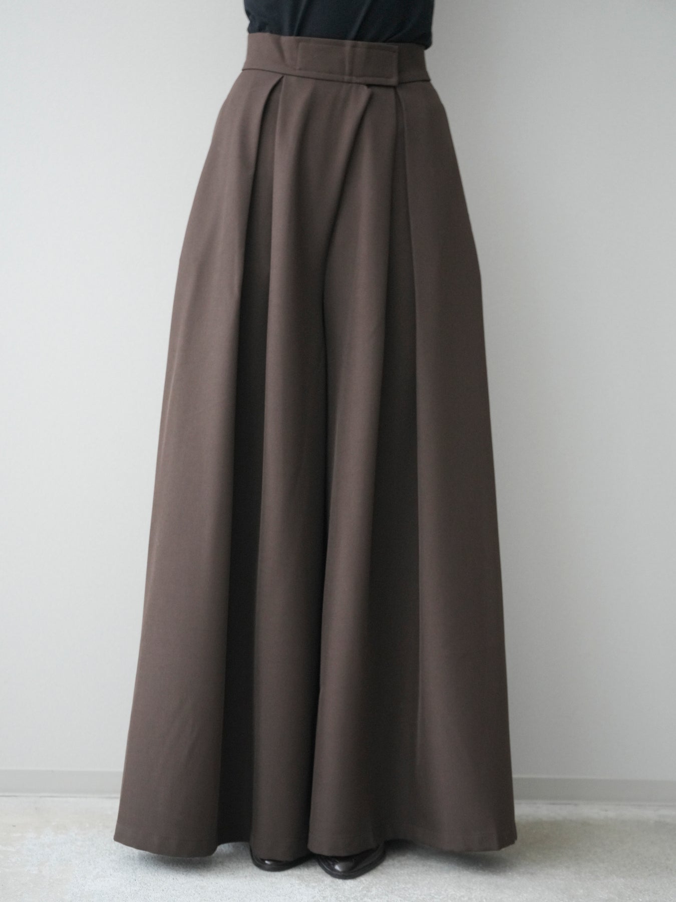 フロントに入ったタックが美しいドレープを生み出す、存在感のあるバギーパンツ。 たっぷりとした分量感が動くたびに表情を変え、スタイリングに奥行きを与えます。 ウエストまわりはすっきりとまとめつつ、腰から裾にかけて自然に広がるシルエットが魅力。 テープベルトがさりげないアクセントとなり、シンプルなトップスと合わせてもバランスよく決まります。 きれいめからカジュアルまで幅広く取り入れやすく、シーズンを通して活躍する一本です。