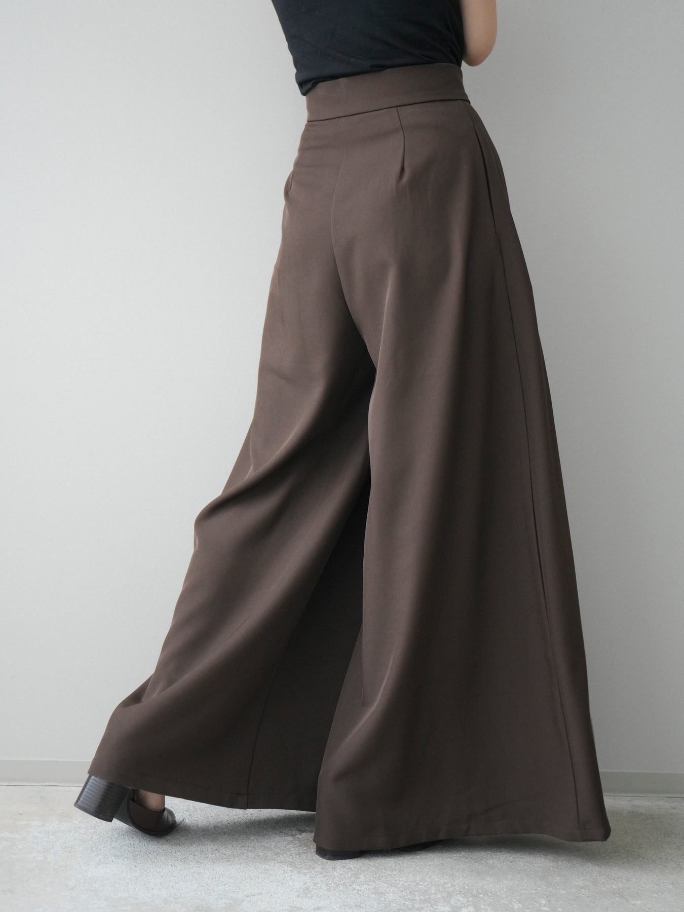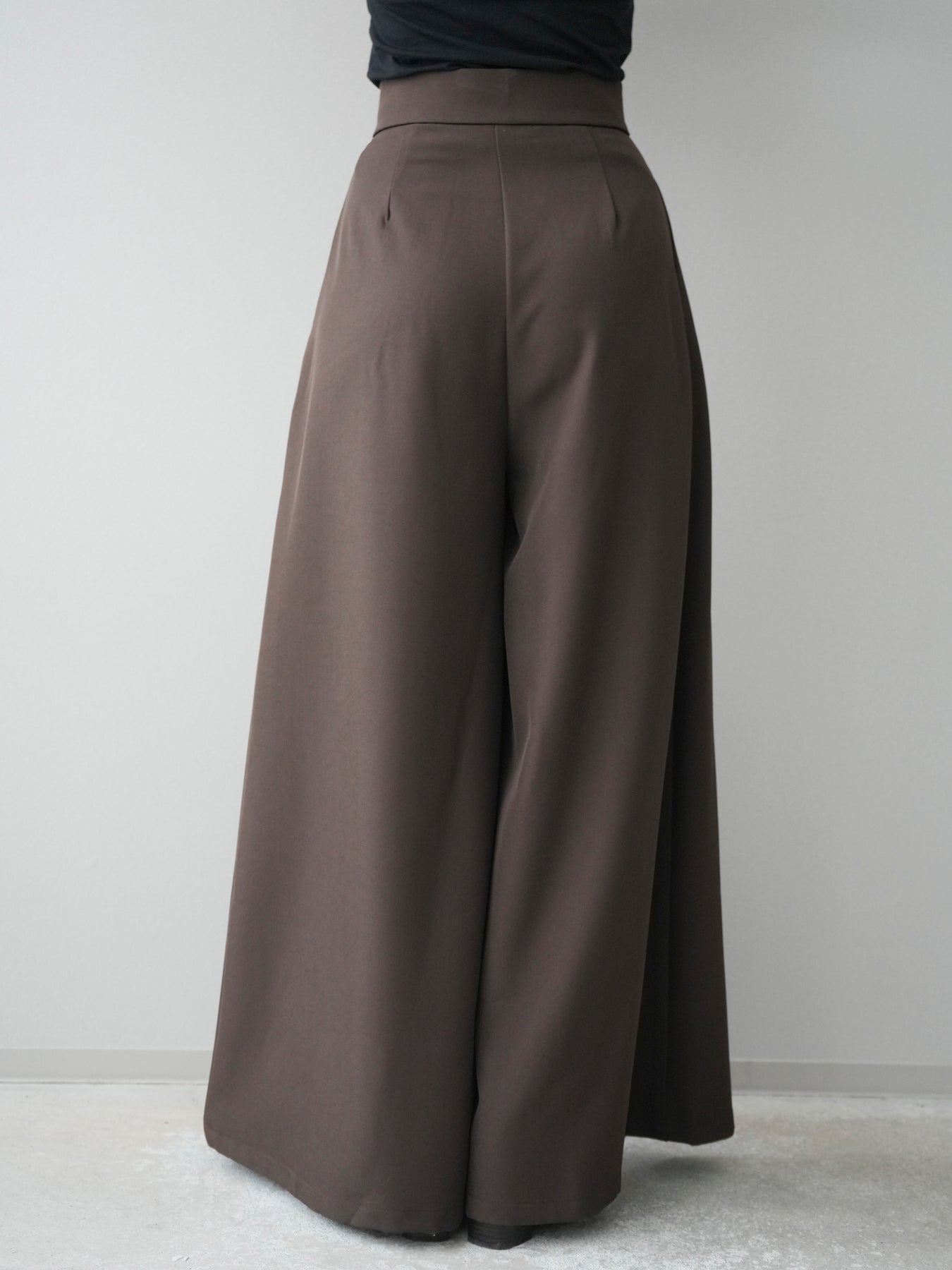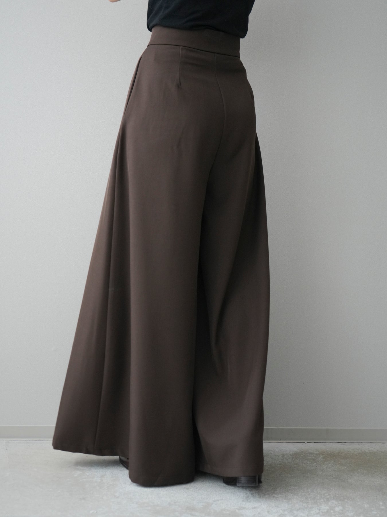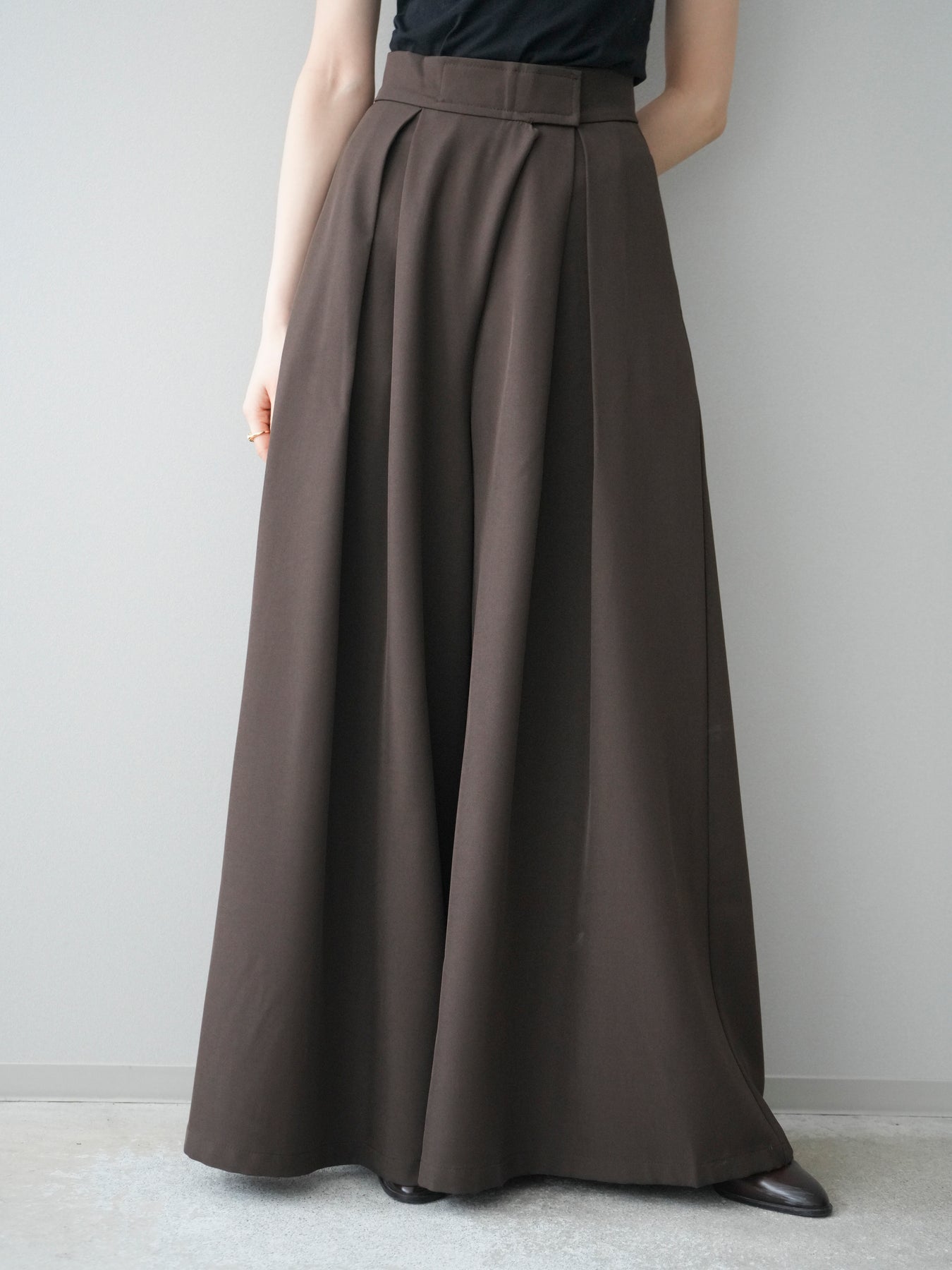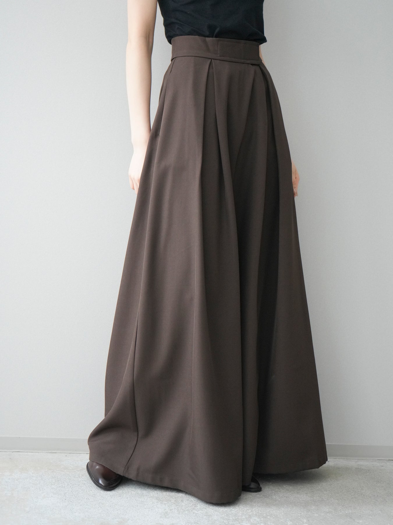 フロントに入ったタックが美しいドレープを生み出す、存在感のあるバギーパンツ。 たっぷりとした分量感が動くたびに表情を変え、スタイリングに奥行きを与えます。 ウエストまわりはすっきりとまとめつつ、腰から裾にかけて自然に広がるシルエットが魅力。 テープベルトがさりげないアクセントとなり、シンプルなトップスと合わせてもバランスよく決まります。 きれいめからカジュアルまで幅広く取り入れやすく、シーズンを通して活躍する一本です。
