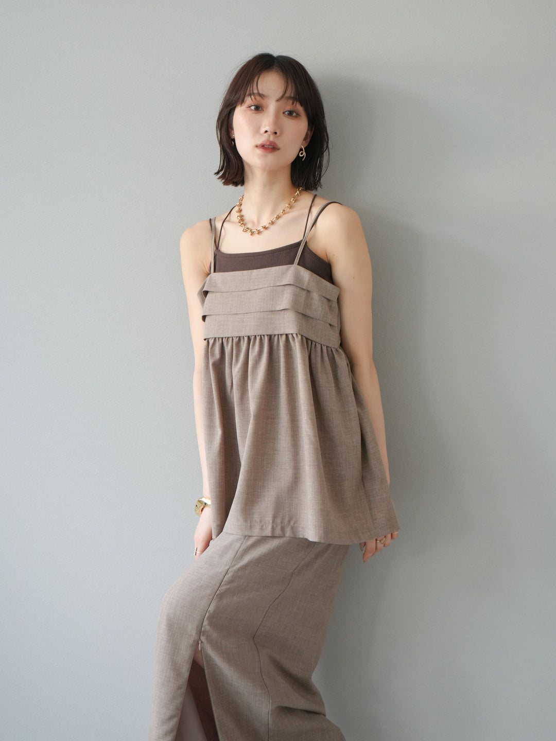 [予約]リネンライクビスチェデザインキャミソール/グレージュ