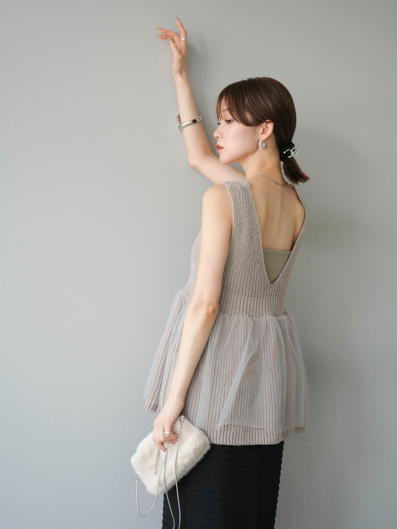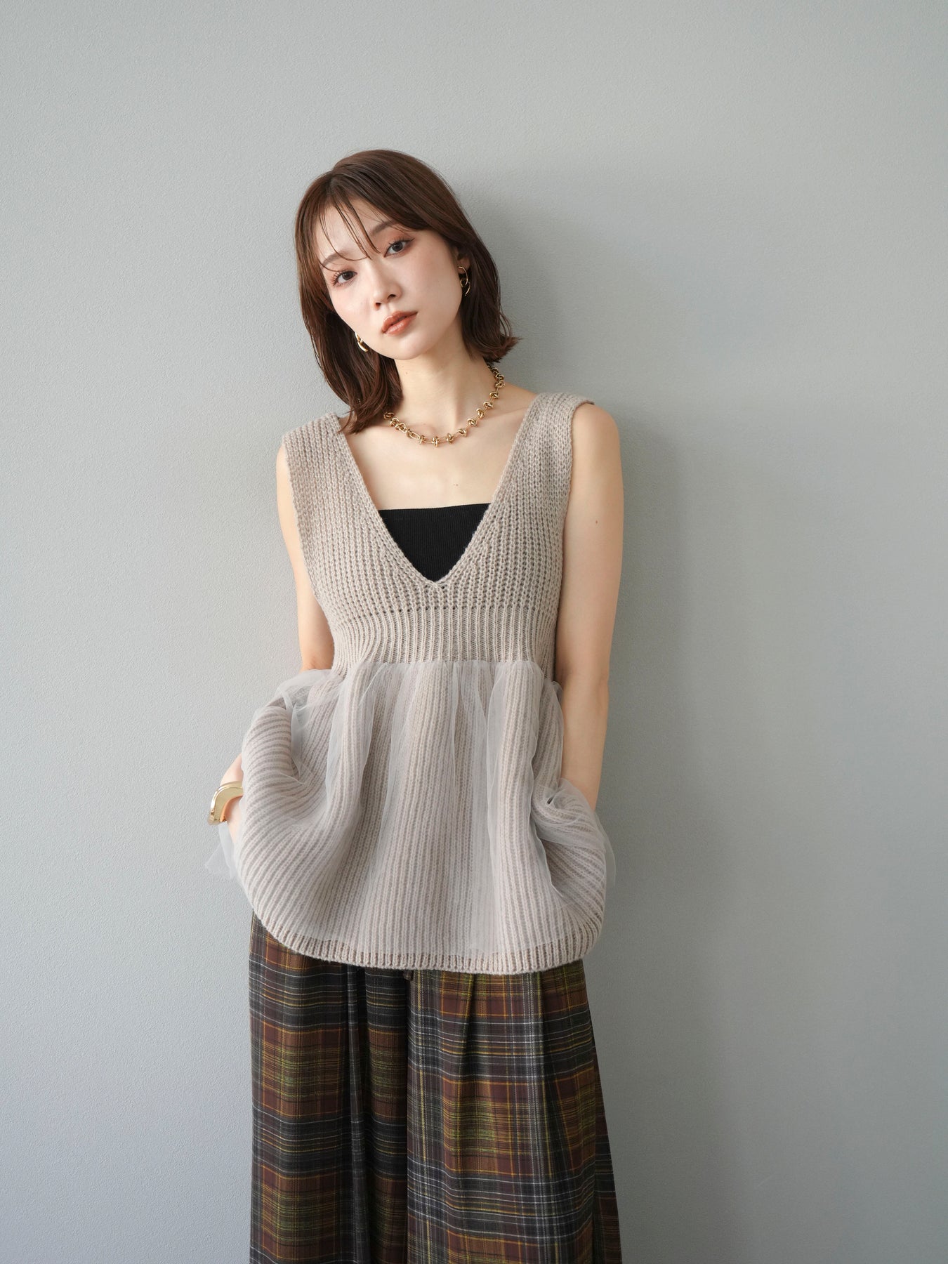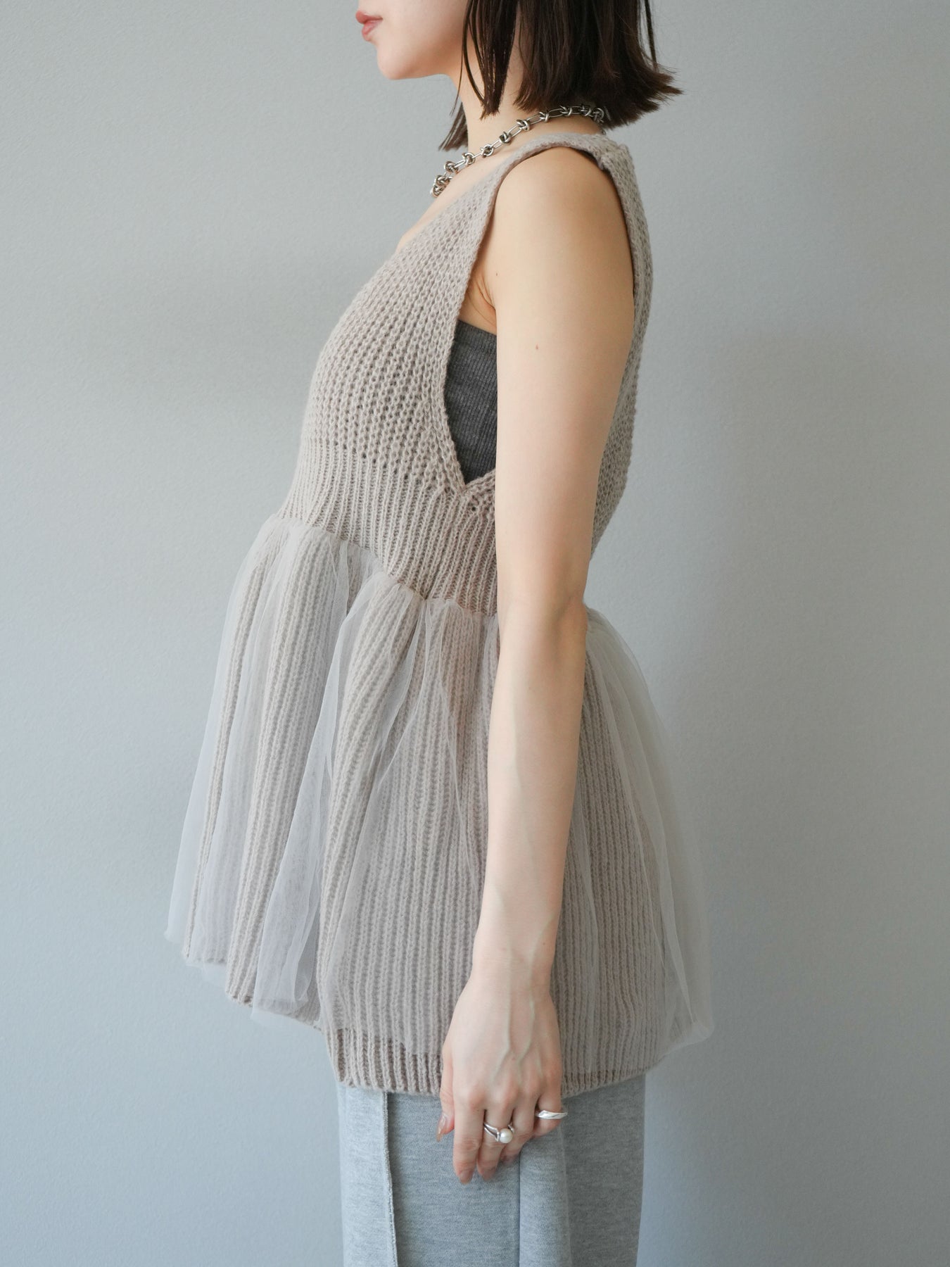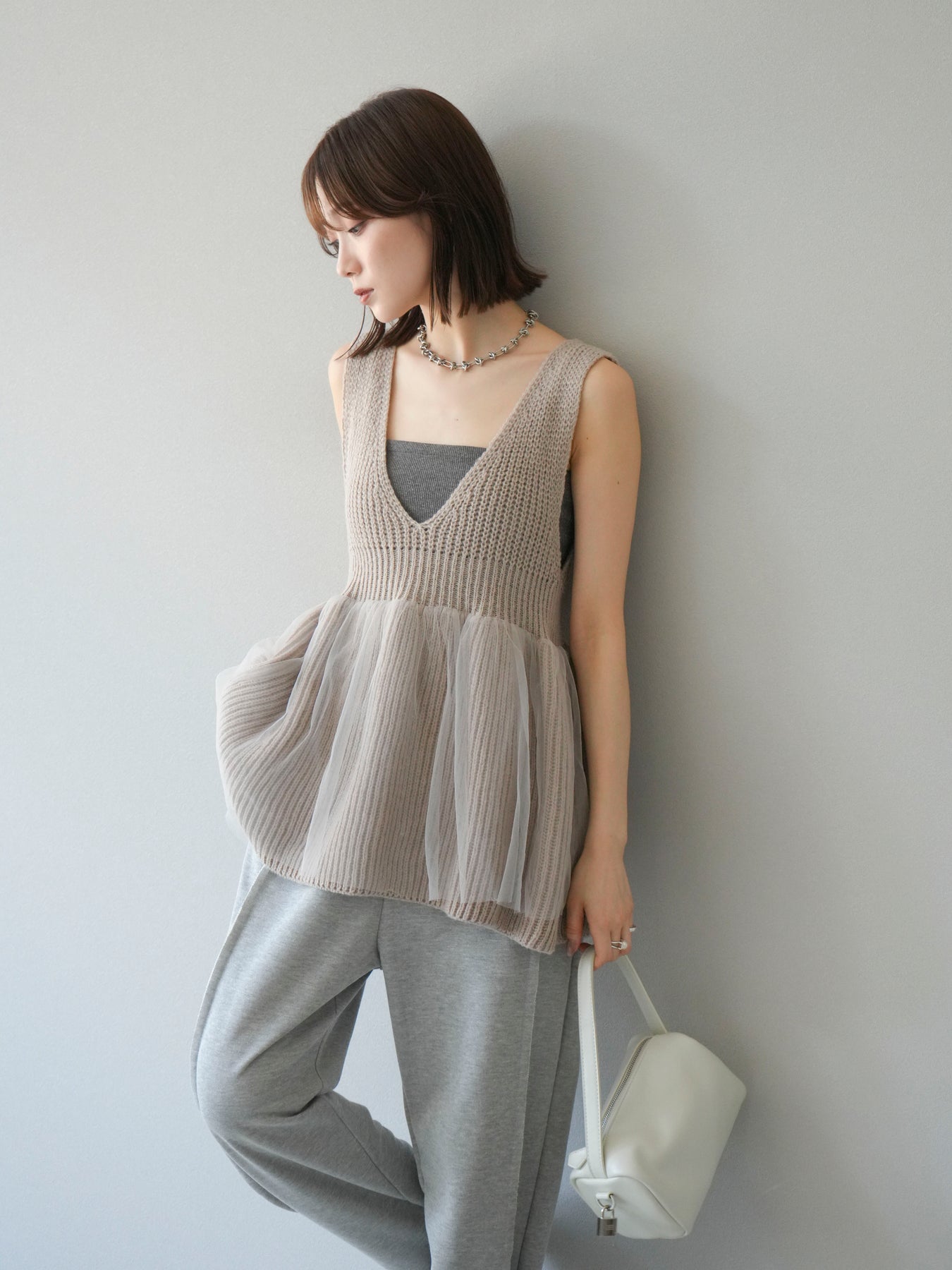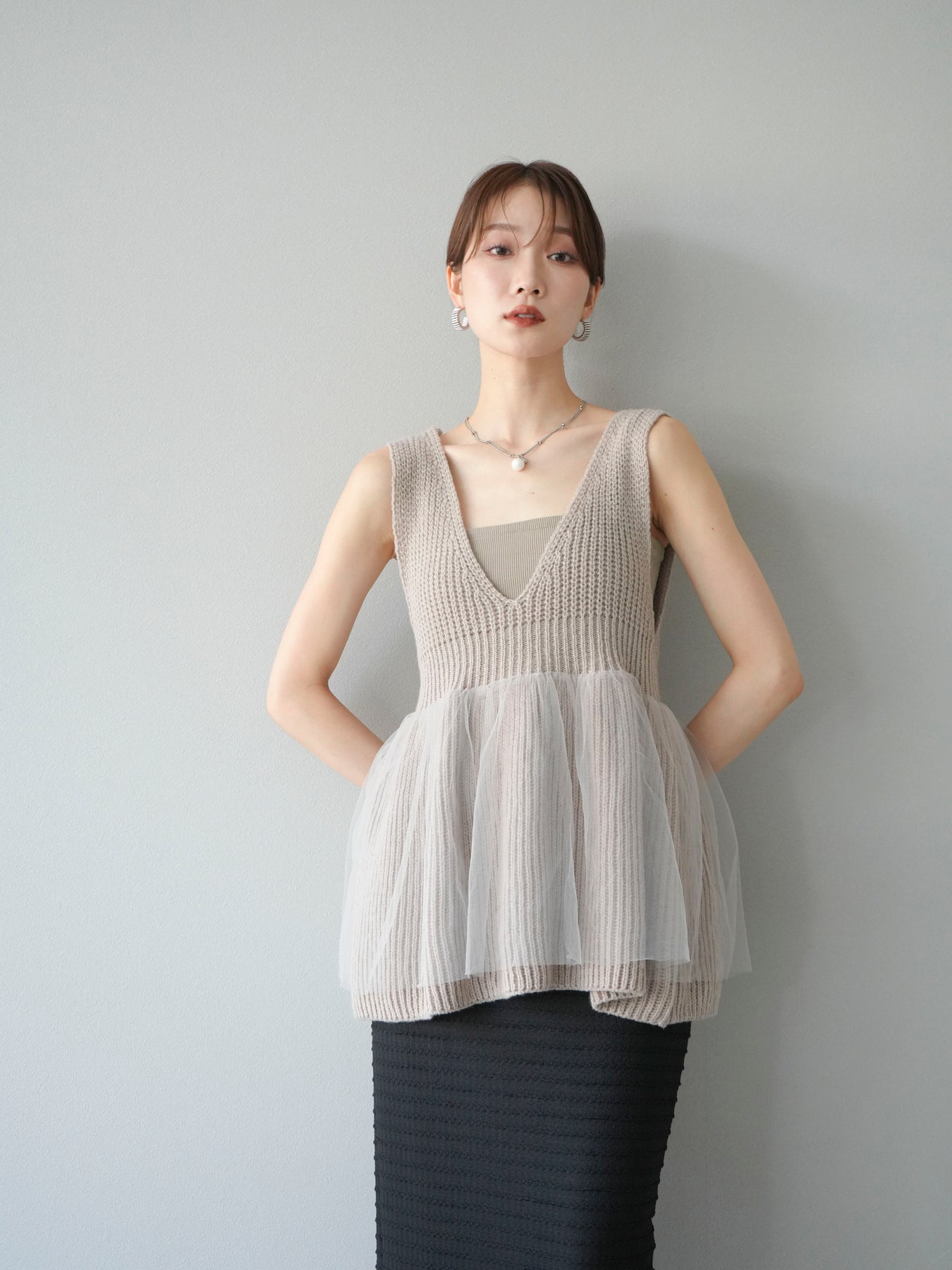 [予約]チュールレイヤードペプラムニットベスト/グレージュ