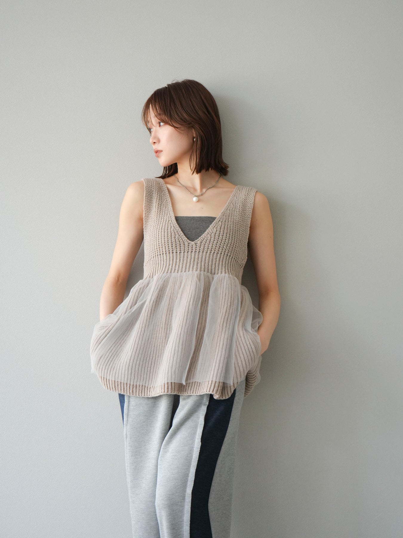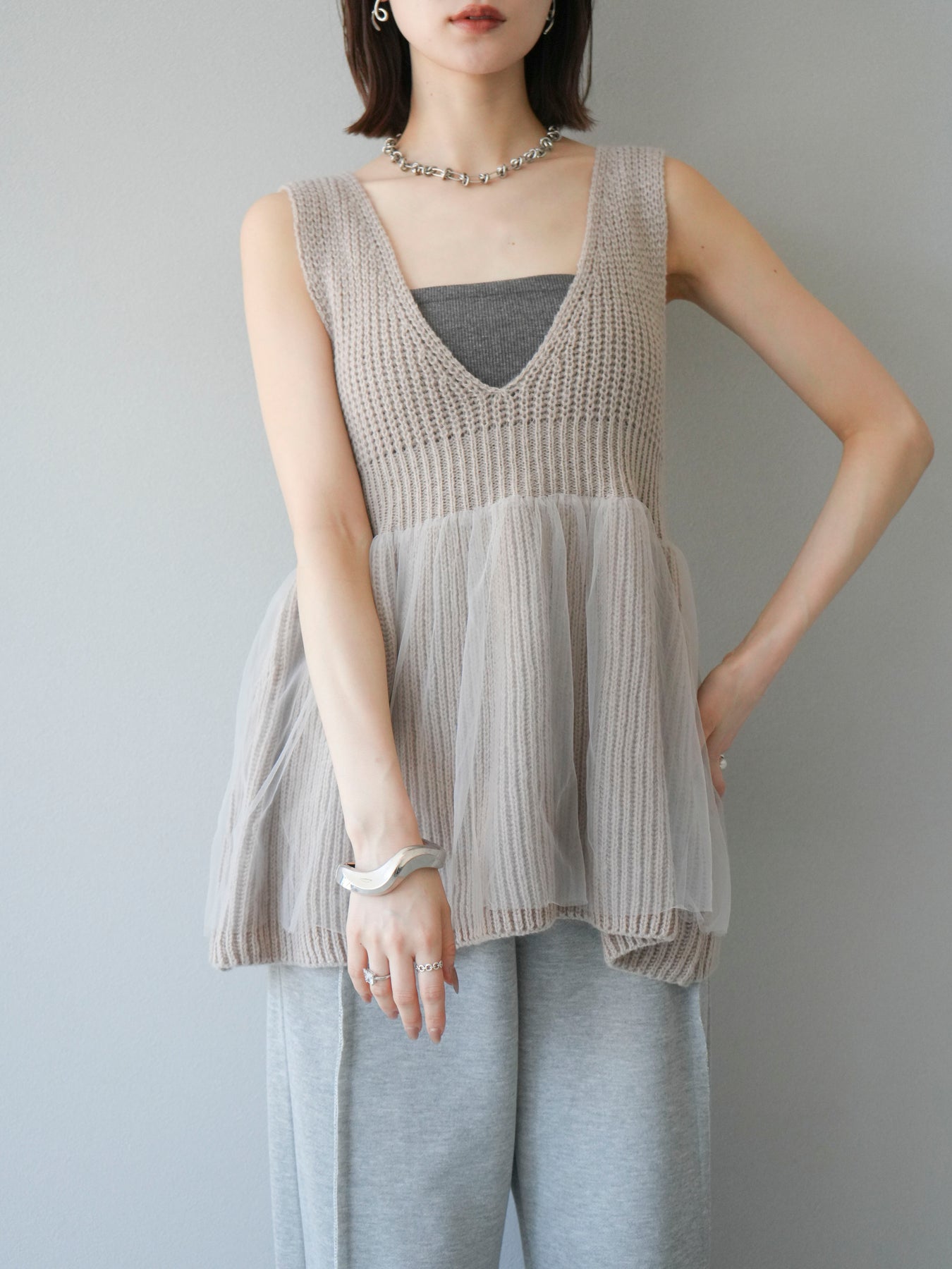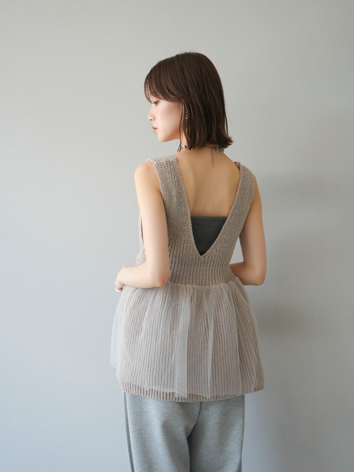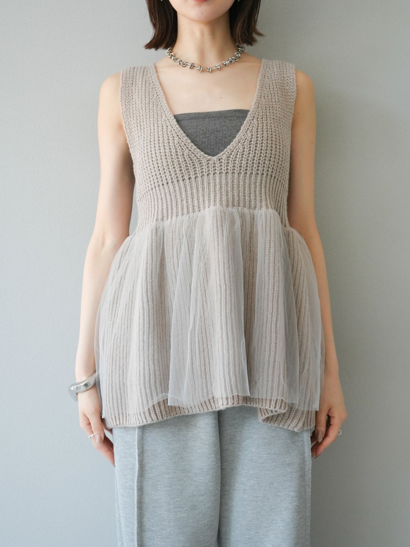 [予約]チュールレイヤードペプラムニットベスト/グレージュ