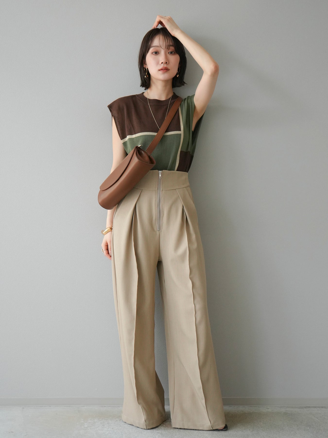 大胆な配色ラインが目を惹く、配色ノースリーブニットプルオーバー。グラフィカルなブロッキングデザインがスタイリングのアクセントになり、1枚で洗練された印象を与えてくれる主役トップスです。程よい厚みと柔らかな肌触りのニット素材で、快適な着心地を実現。肩をやや覆うスリーブデザインが気になる肩まわりをさりげなくカバーし、すっきりとしたバランスに仕上がります。パンツにもスカートにも好相性で、デイリーからオフィスカジュアルまで活躍する万能アイテムです。 ※ボトムス、キャミソール(インナー)以外の商品は一律でインナーは付属していません。