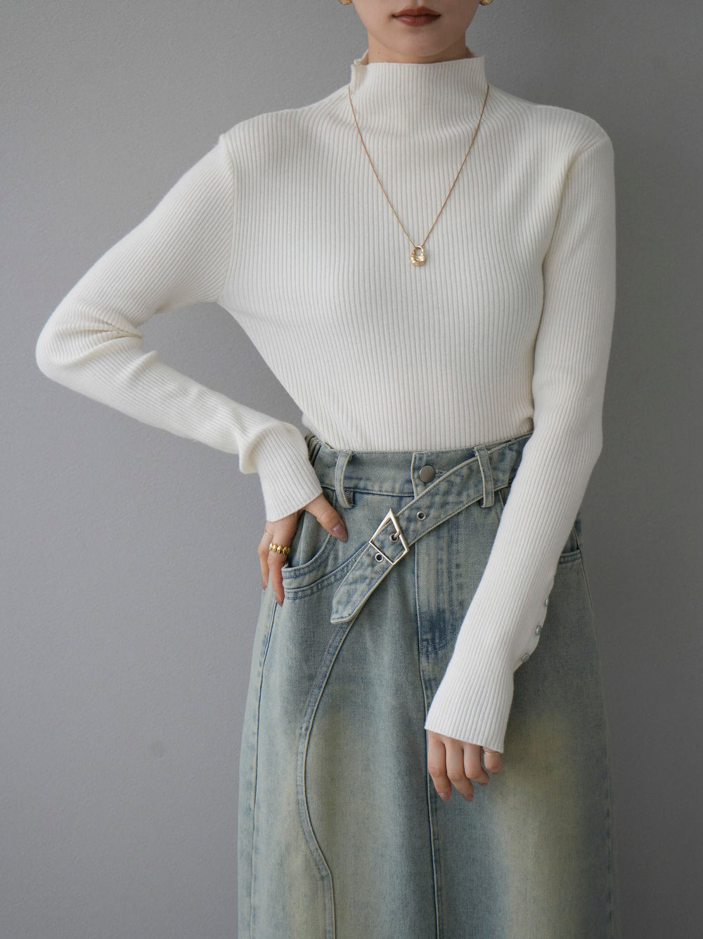 [予約]袖ボタンハイネックリブニットトップス/アイボリー