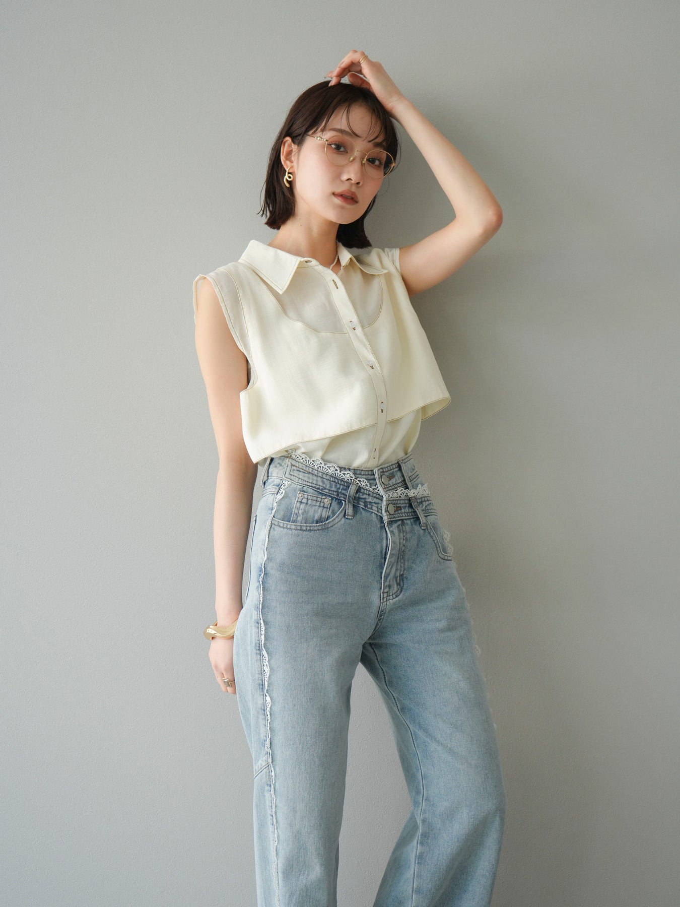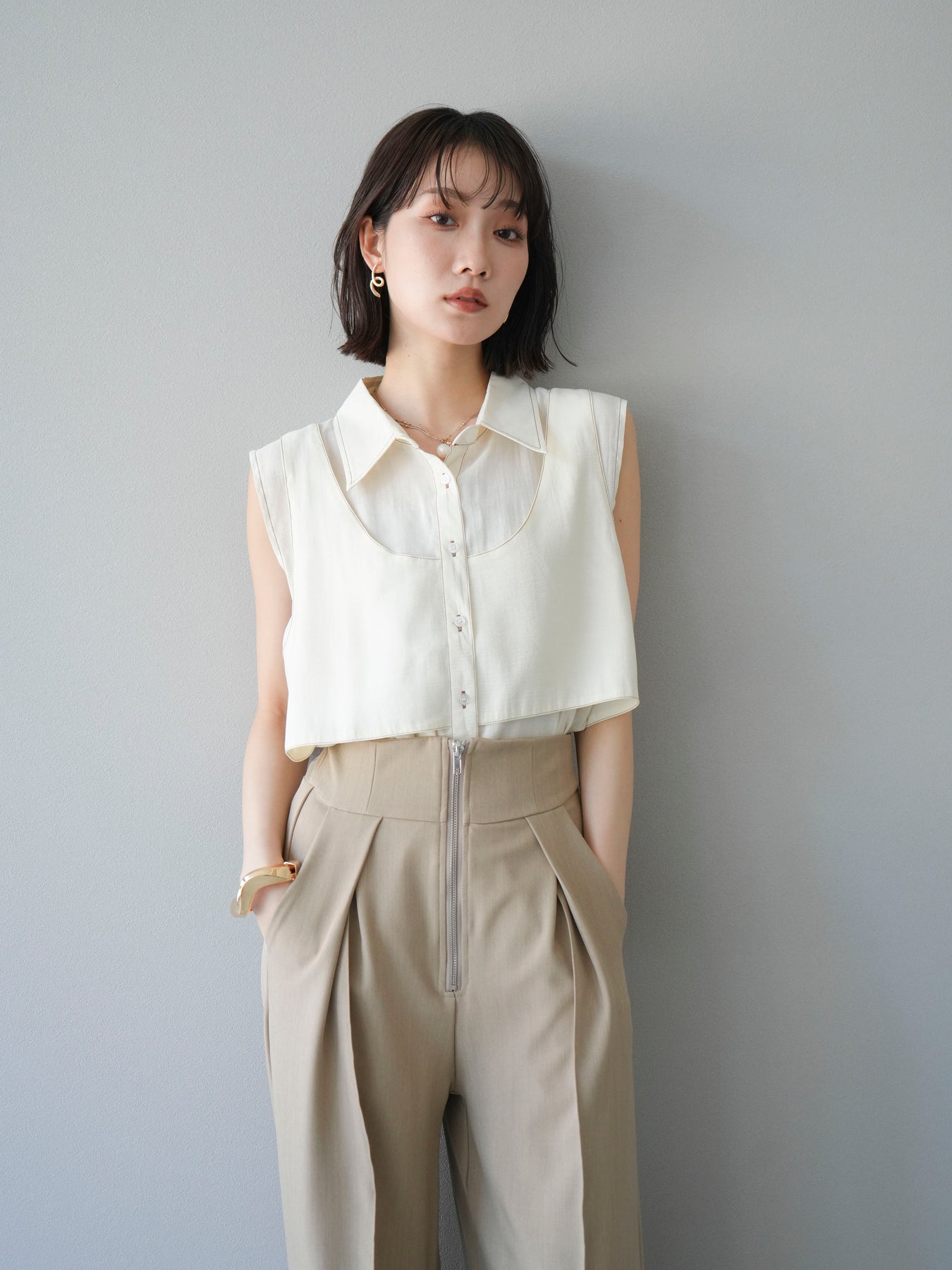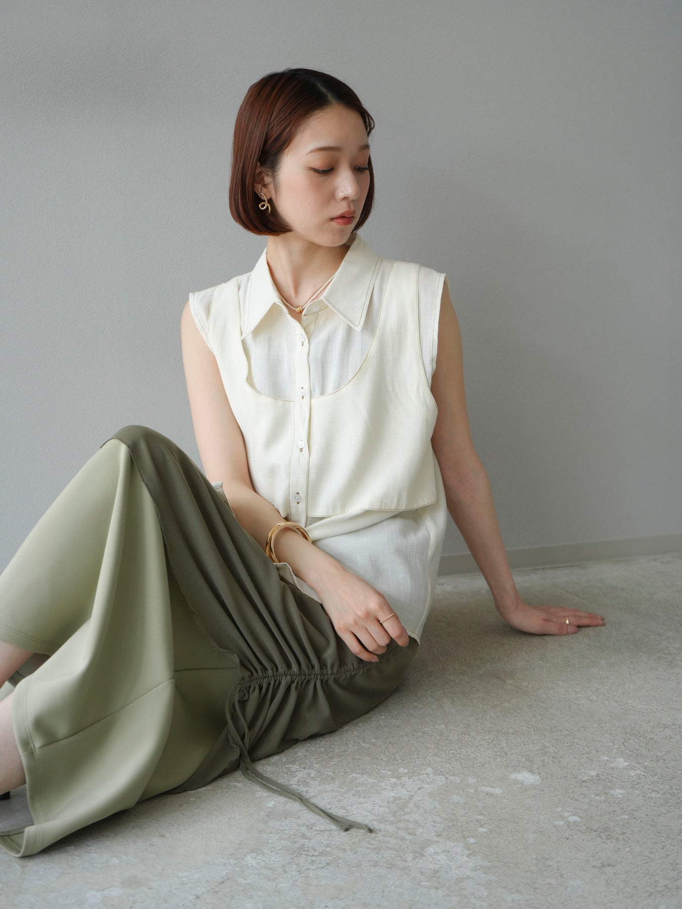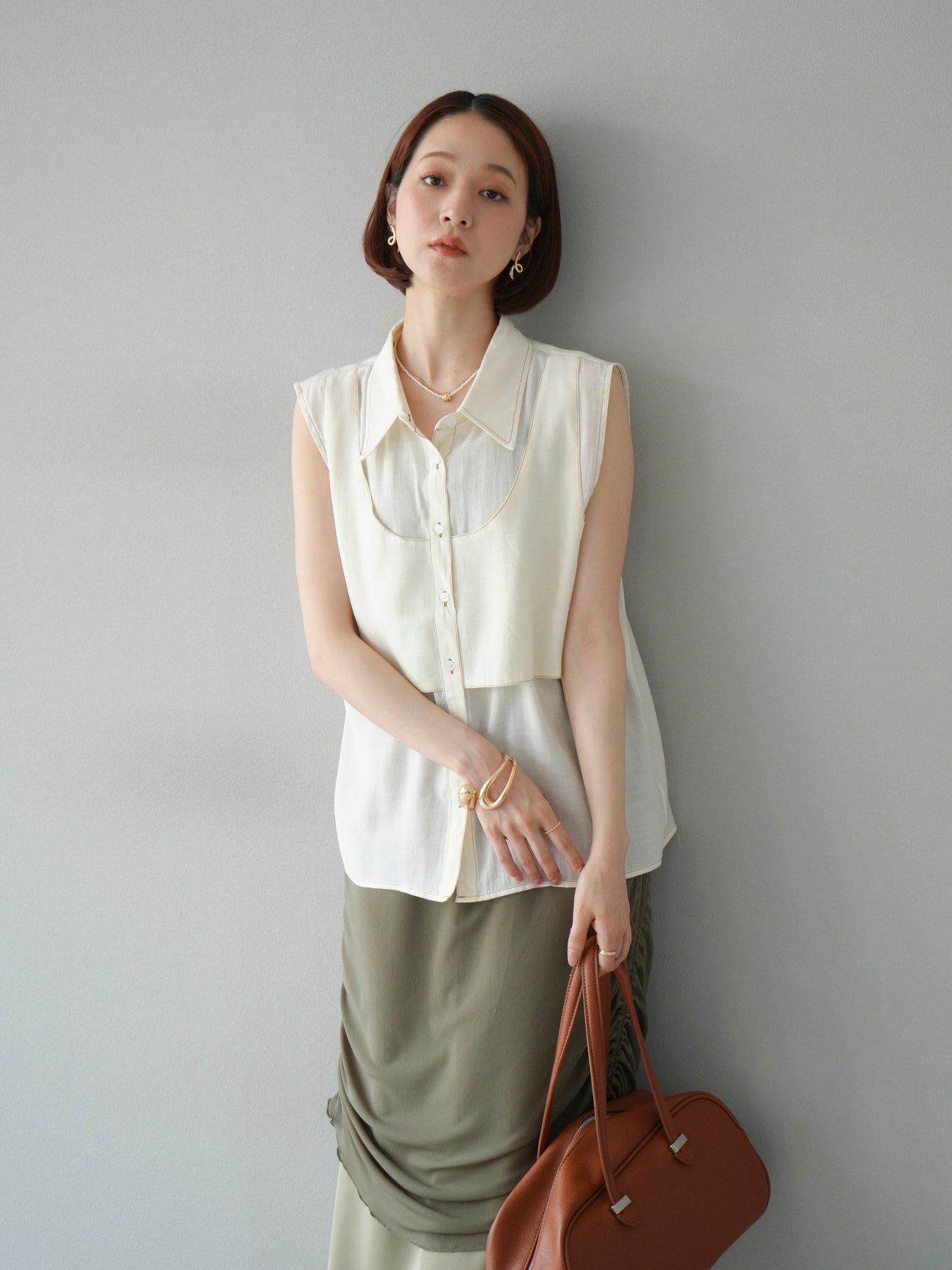[予約]ステッチシアーレイヤードデザインブラウス/アイボリー