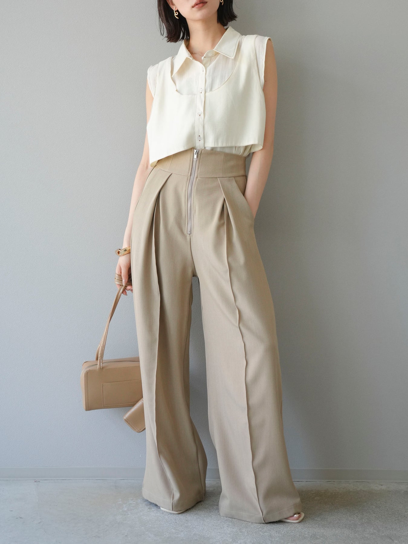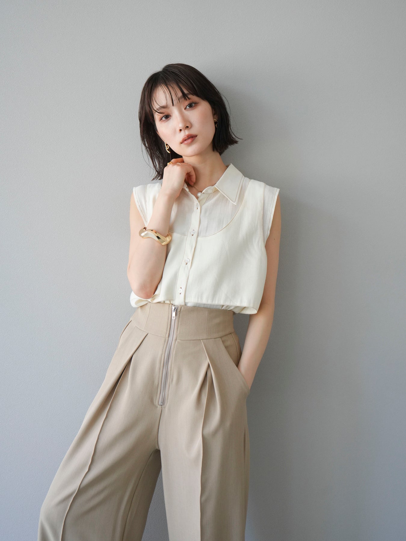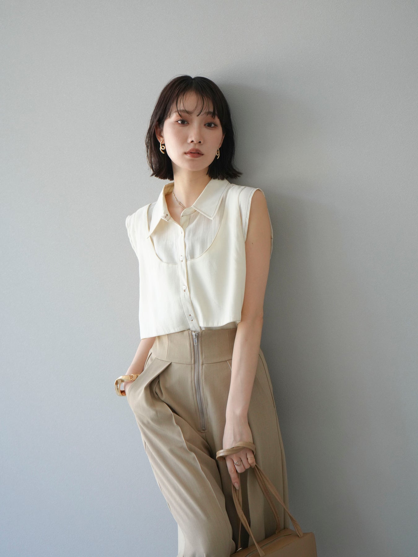 ビスチェを重ねたようなレイヤードデザインが目を惹く、ステッチシアーレイヤードデザインブラウス。程よい透け感のある軽やかな素材と、異素材切り替えによる立体的なシルエットが洗練された印象を演出します。細やかなステッチがアクセントになり、シンプルながらもディテールにこだわった一枚。ボトムスを選ばず、パンツでもスカートでも好バランスに着こなせます。トレンド感と着回し力を兼ね備えた、大人のためのモードブラウスです。 ※ボトムス、キャミソール(インナー)以外の商品は一律でインナーは付属していません。