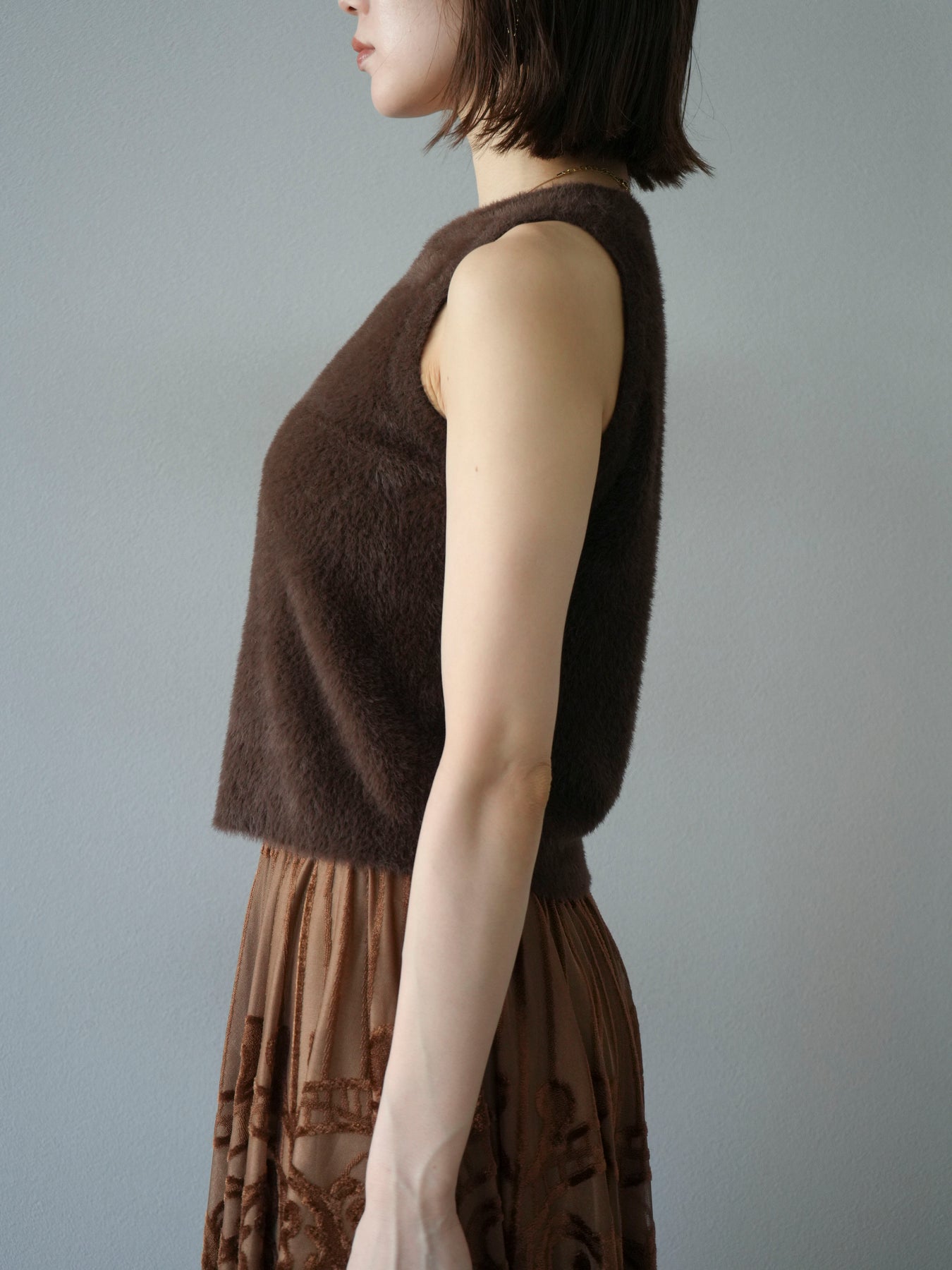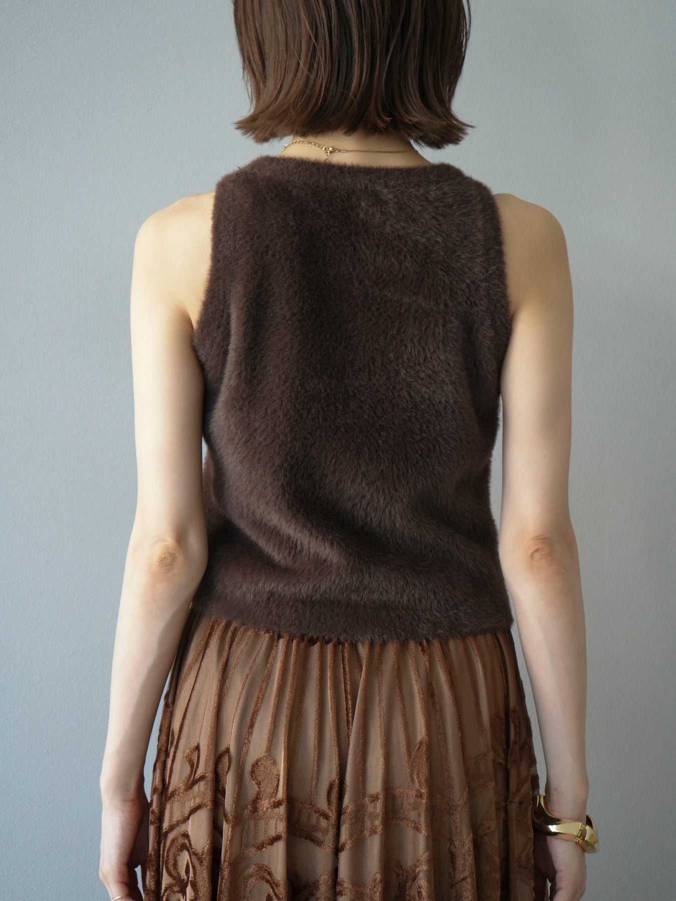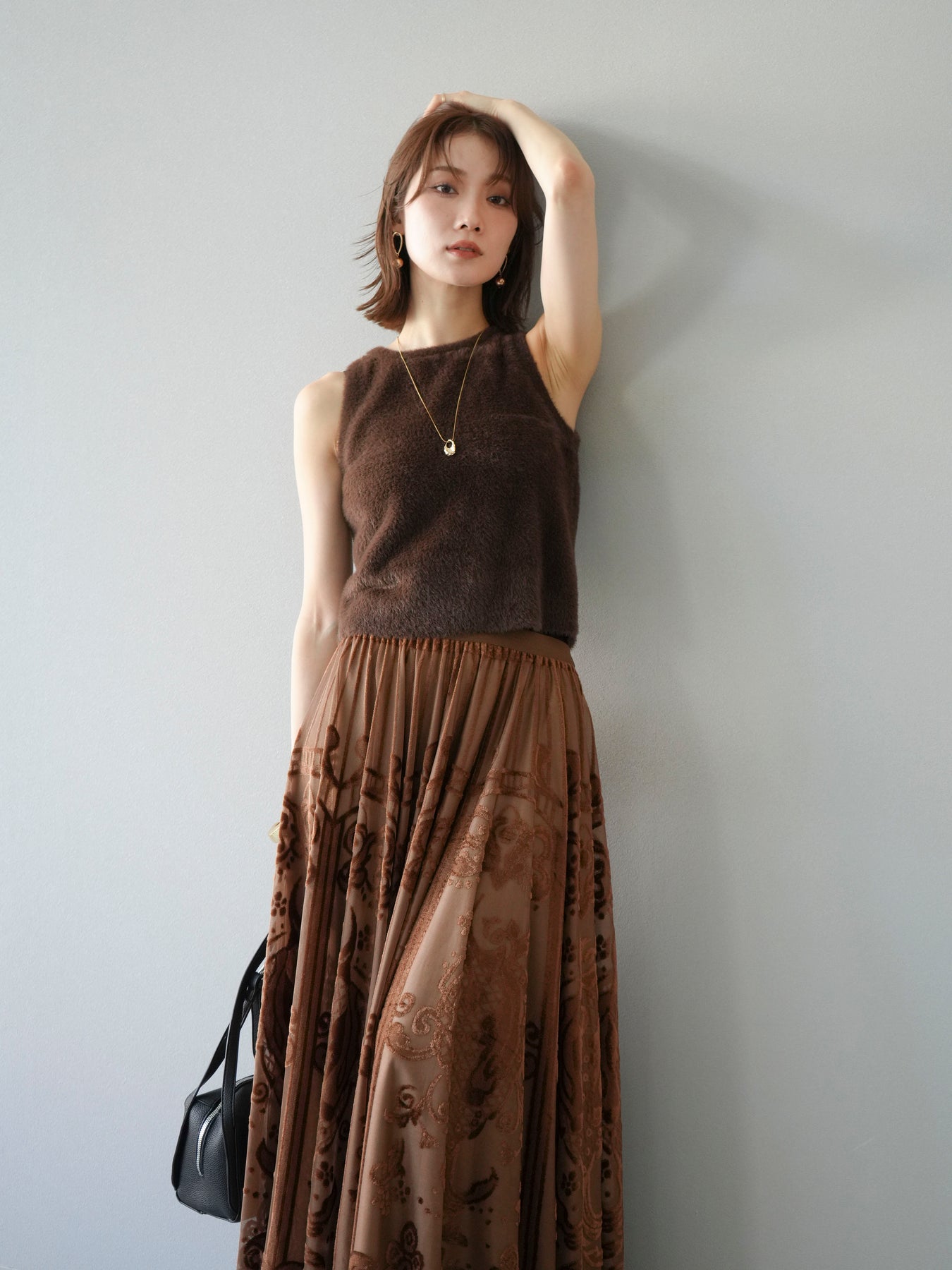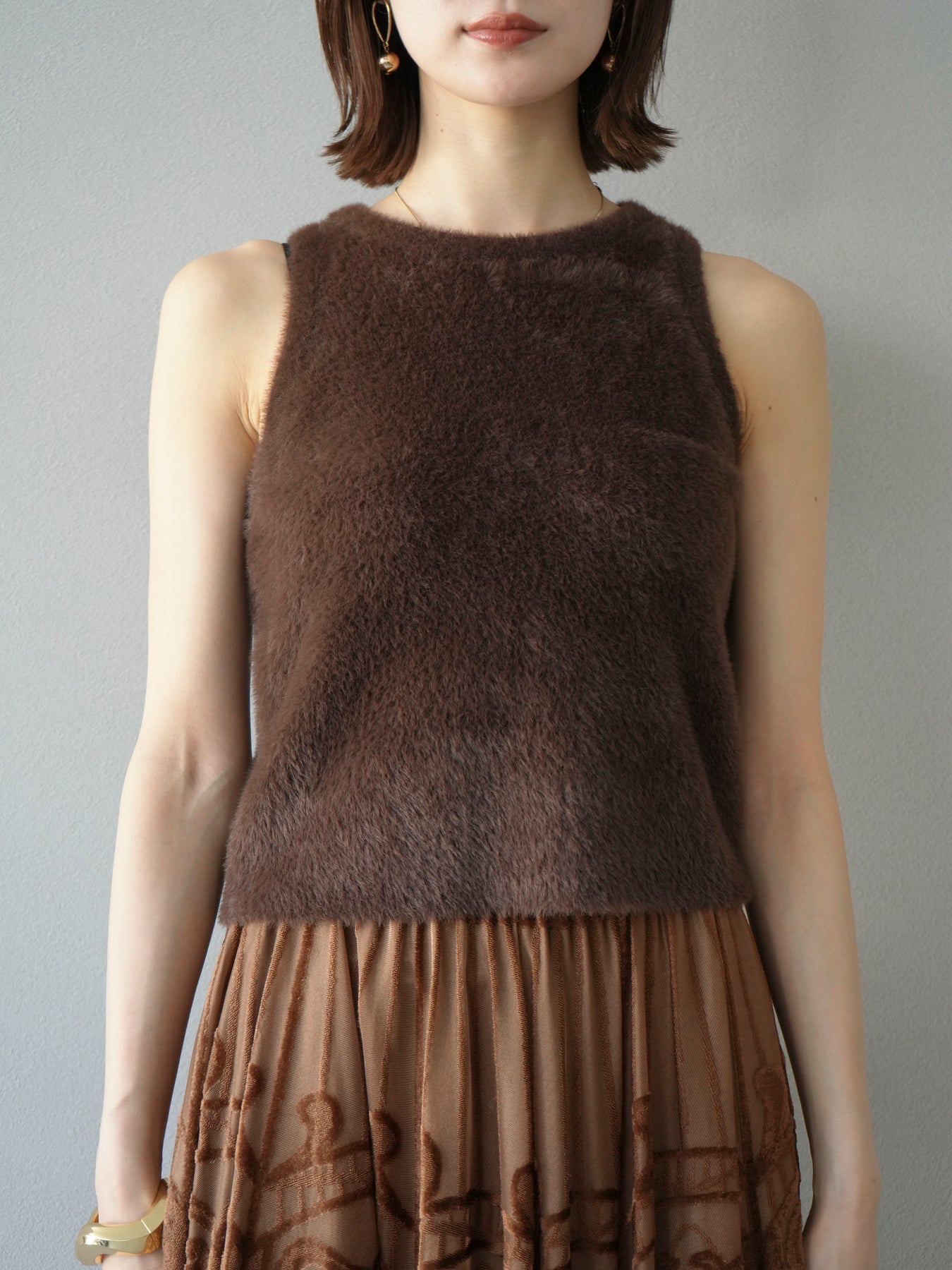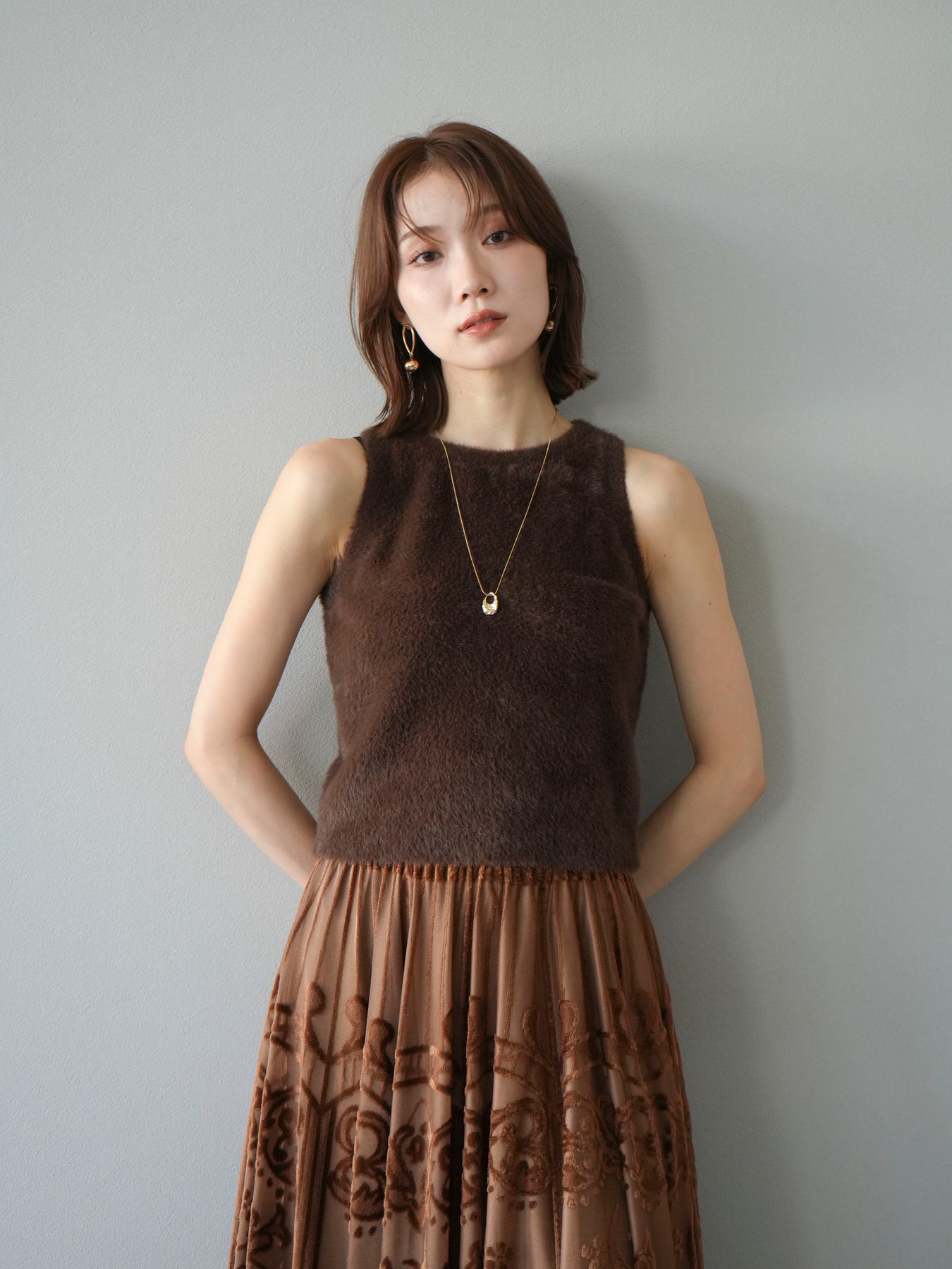 ふんわりとしたシャギー素材を使用したニットタンクトップ。毛足のある柔らかな風合いがシーズンムードを高め、1枚でもレイヤードでも着映えするアイテムです。程よくコンパクトなシルエットで、ボトムスとのバランスが取りやすく、スカートにもパンツにも好相性。シンプルながらも素材感で存在感を放ち、アクセサリーを合わせればより華やかな印象に。インナーにシャツやシアートップスを重ねることで、季節を問わずロングシーズン活躍します。 ※ボトムス、キャミソール(インナー)以外の商品は一律でインナーは付属していません。
