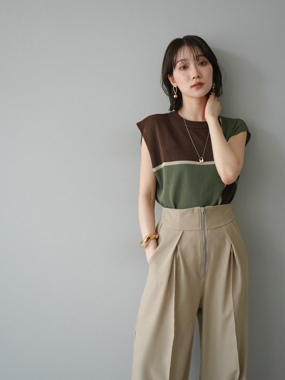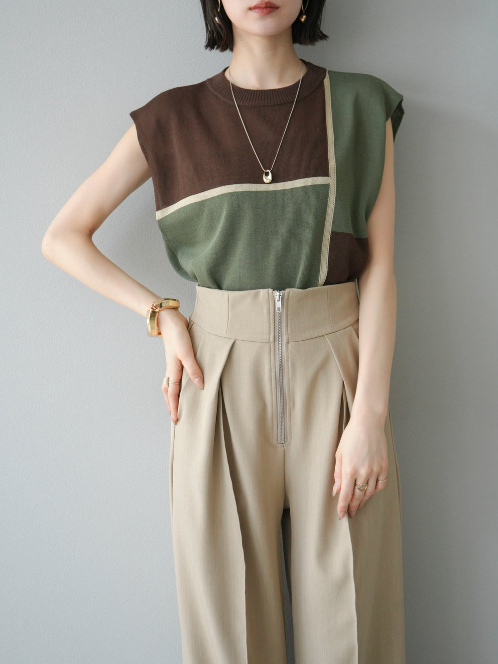 [予約]配色ノースリーブニットプルオーバー/ブラウン