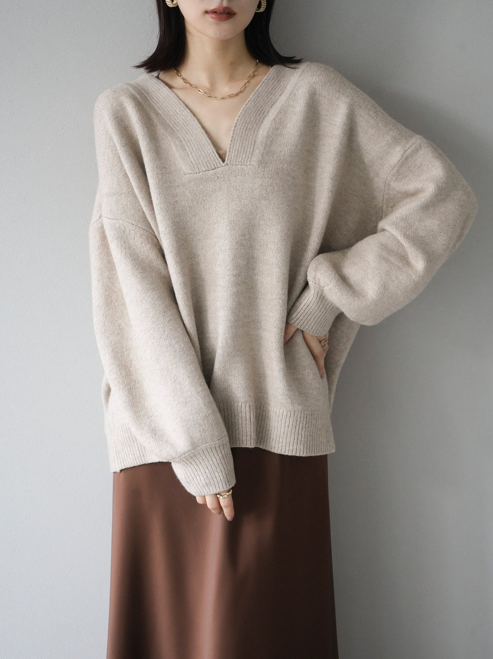[予約]カーブVネックニットプルオーバー/ベージュ