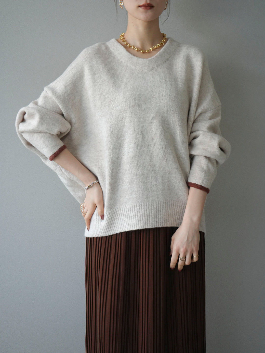 [予約]Vネック配色スリーブニットプルオーバー/oatmeal